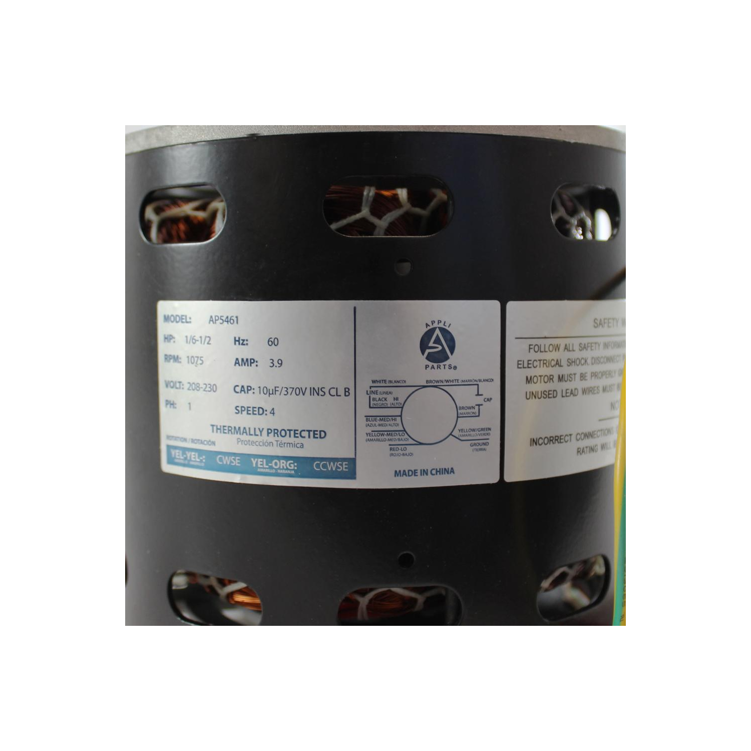 Appli Parts Fan Motor Evaporator Rescue Type 1/6-1/2hp 230v 60hz 3.9a 1075rpm 10mfd/370vac 4spd Revers Ballb 1sft Ul E486336 APFM-5461 Ref. 5461