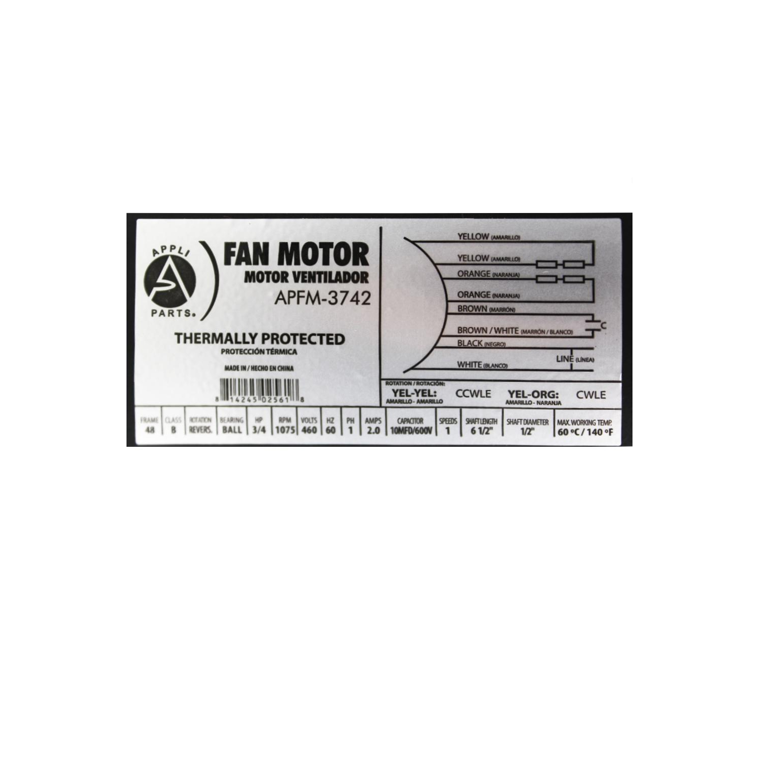 Fan Motor Vertical Condenser Type 3/4hp 460v 60hz 2.0a 1075rpm 10mfd/600vac Revers Ballb 1sft Appli Parts Apfm-3742 Ref. 3742