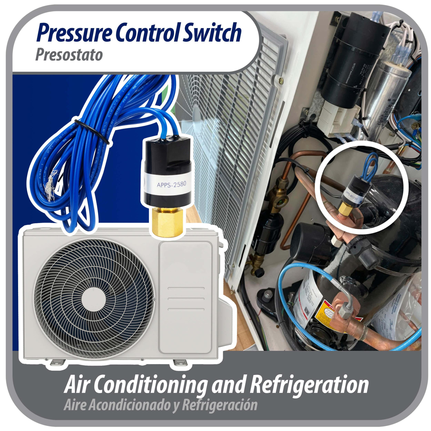 Appli Parts Pressure control switch Low Open 25 psi Close 80 psi 39-3/8in cable SPST 1/4in female connection Automatic Reset universal air conditioning applications APPS-2580 Use: for air conditioning R22 applications Specs: Single Pole Single Throw, Auto reset, Opens at 25 psi Closes at 800 psi, 1/4 in female connection with 39-3/8 cable. Tamper Safe factory sealed construction Construction: Made following high quality standards to comply with OEM specifications Installation: Direct mounting on flare pressure port Quality: All our products are designed and manufactured following very strict procedures and high quality standards during their manufacture. An optimal selection of materials is made, combined with research and development procedures, which guarantee the durability and performance of each manufactured product, offering our customers the same efficiency expected from an original part