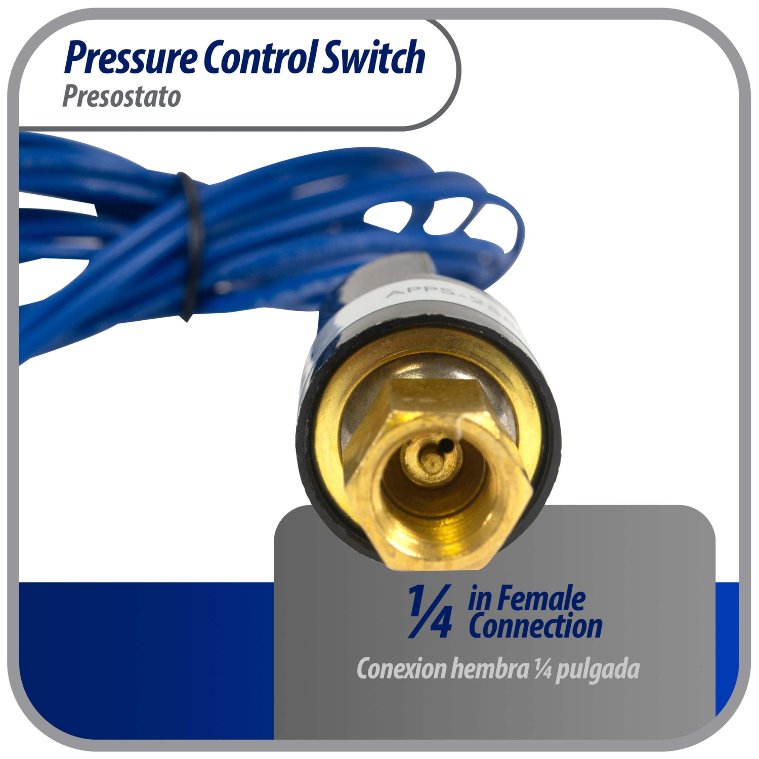 Specs: Single Pole Single Throw, Auto reset, Opens at 25 psi Closes at 800 psi, 1/4 in female connection with 39-3/8 cable. Tamper Safe factory sealed construction