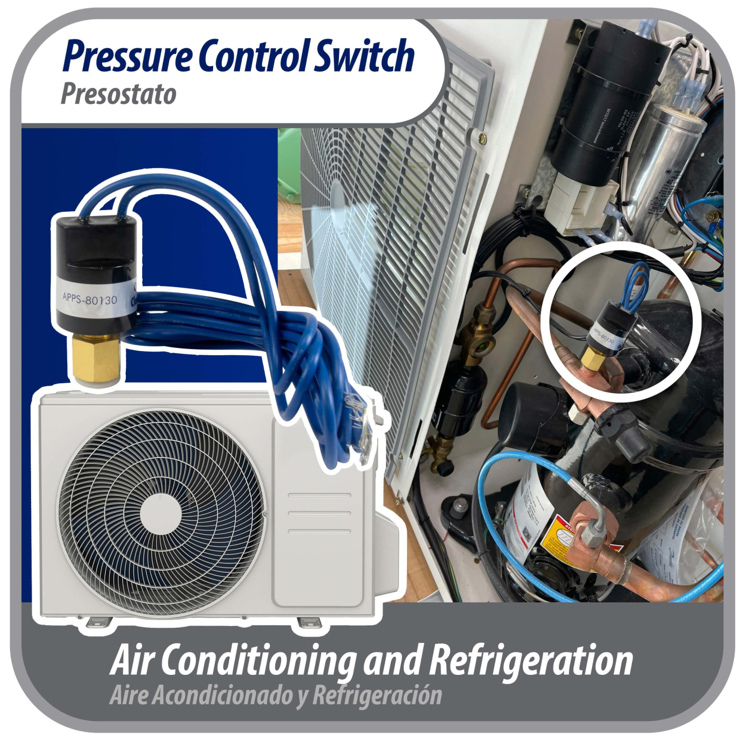 Appli Parts Pressure control switch Low Open 80 psi Close 130 psi 39-3/8in cable SPST 1/4in female connection Automatic Reset universal air conditioning applications APPS-80130 Use: for air conditioning R410 applications Specs: Single Pole Single Throw, Auto reset, Opens at 80 psi Closes at 130 psi, 1/4 in female connection with 39-3/8 cable. Tamper Safe factory sealed construction Construction: Made following high quality standards to comply with OEM specifications Installation: Direct mounting on flare pressure port Quality: All our products are designed and manufactured following very strict procedures and high quality standards during their manufacture. An optimal selection of materials is made, combined with research and development procedures, which guarantee the durability and performance of each manufactured product, offering our customers the same efficiency expected from an original part