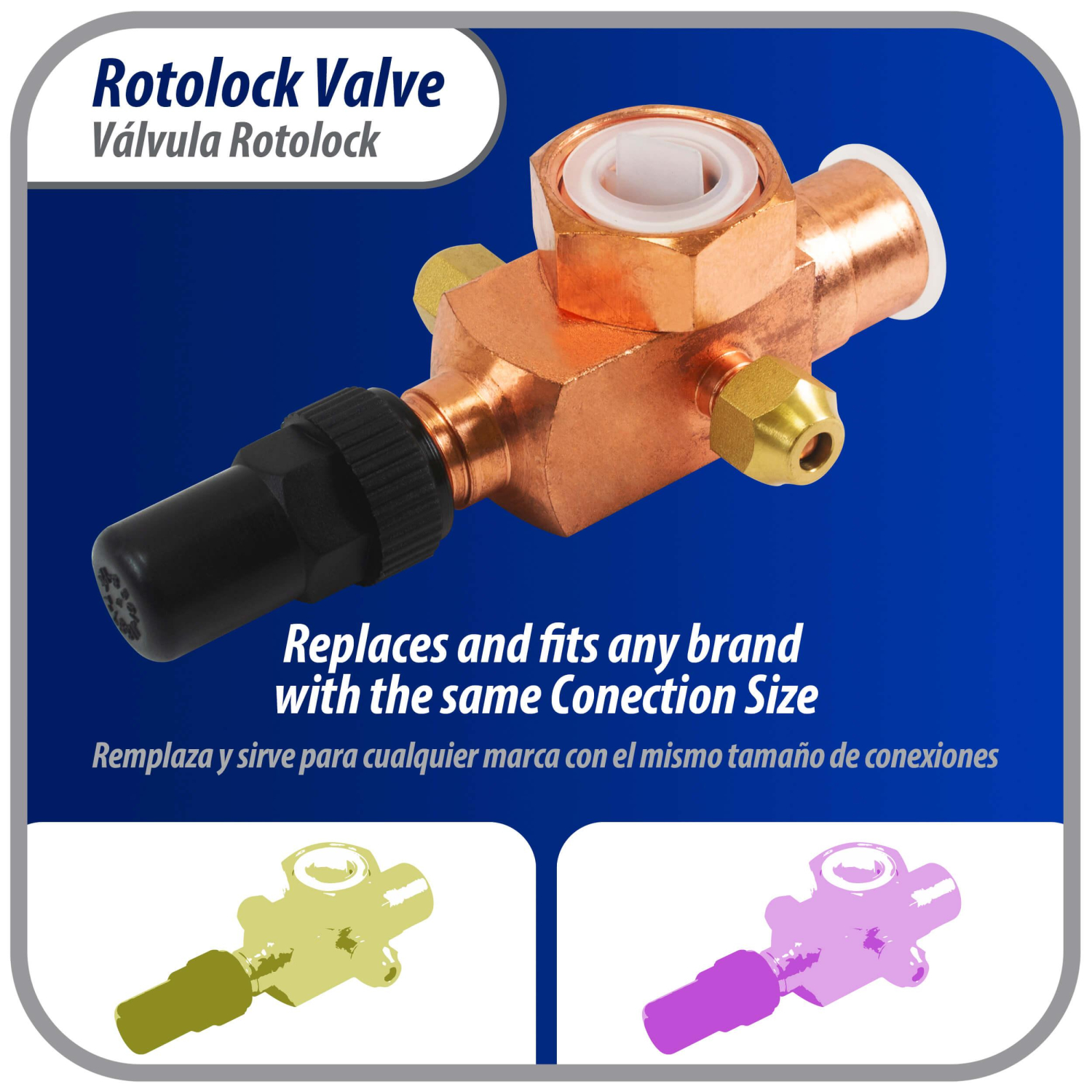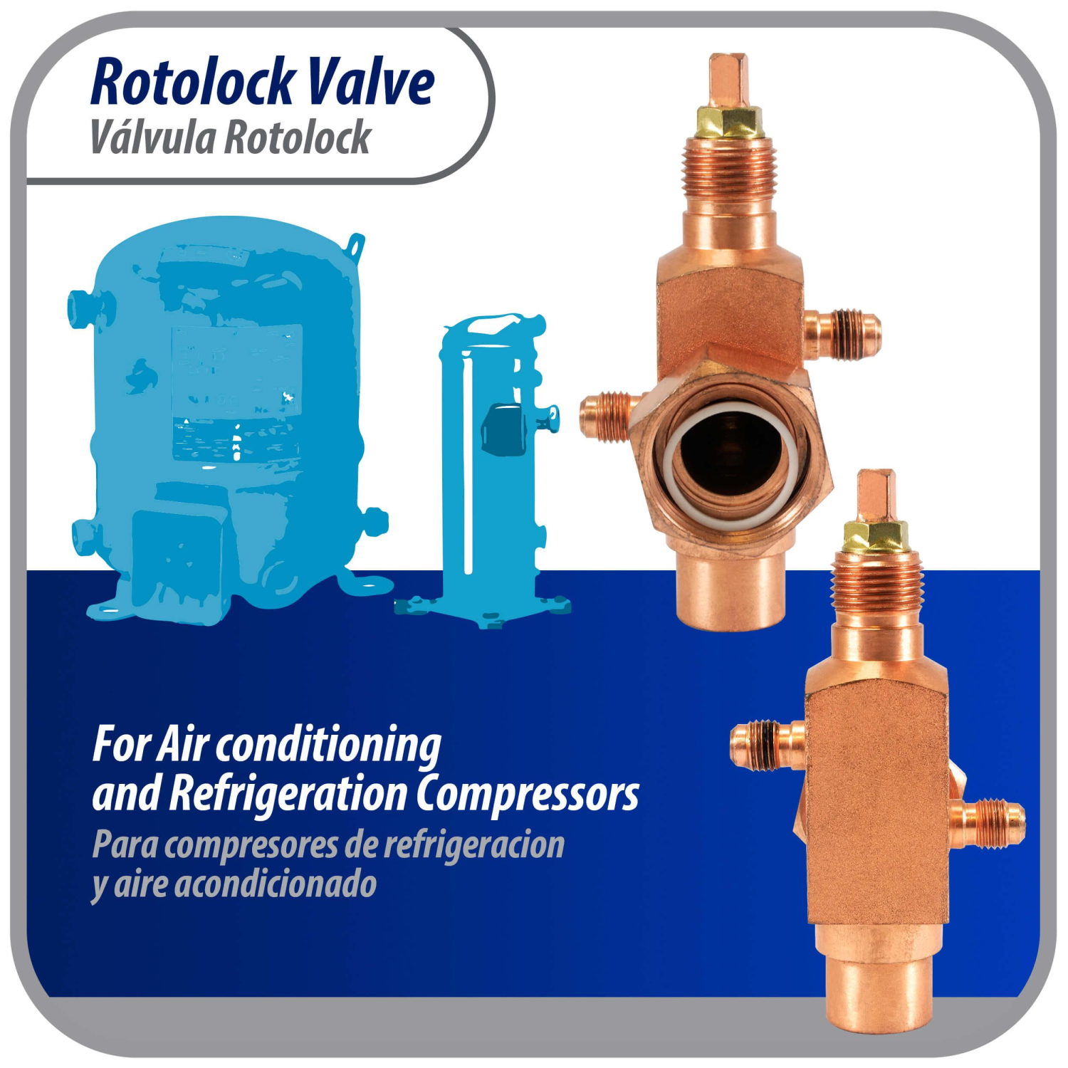 Appli Parts Rotolock Valve V05 1-1/4 in x 7/8 in ODF solder connection Universal replacement valve will work for refrigeration and air conditioning systems APRV-VA05 Use: For refrigeration and air conditioning compressors with rotolock connections Specs: 1-1/4 in flare connection, 7/8 in Discharge ODF solder connection, 1/4 in service port, 1/4 in Pressure switch port, 1/4 hex adjust stem Application: For compressor fitted with Rotolock valves that need to be replaced. This type of valve makes easier compressore replacement Teflone gasket included Quality: High quality product manufactured following OEM requeriments