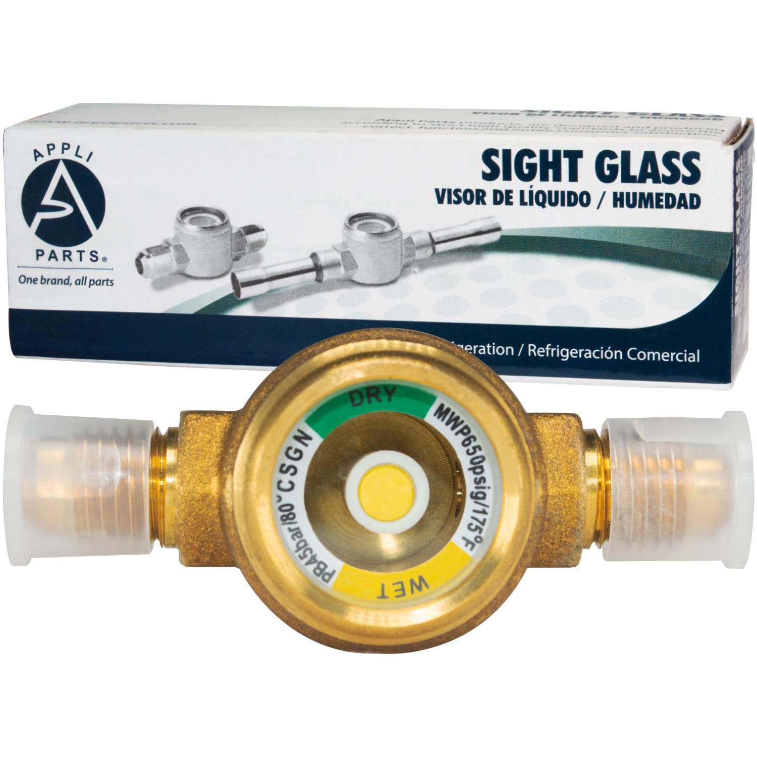Appli Parts Sight Glass and liquid moisture indicator with 1/4 x 1/4 in Flare connections with Solid Body suitable for CFC HCFC HFC refrigerants APSG-14A Use: For refrigeration, Air conditioning and Heating applications Universal: Will replace any brand with similar characteristics Specs: Solid brass body inch long with Flare 1/4 in connections Quality: All our products are designed and manufactured following very strict procedures and high quality standards during their manufacture. An optimal selection of materials is made, combined with research and development procedures, which guarantee the durability and performance of each manufactured product, offering our customers the same efficiency expected from an original part Replaces: SA-12 ALM-1MM2 PSG-2 SGN 6 HMI-1MM2 VIS-14