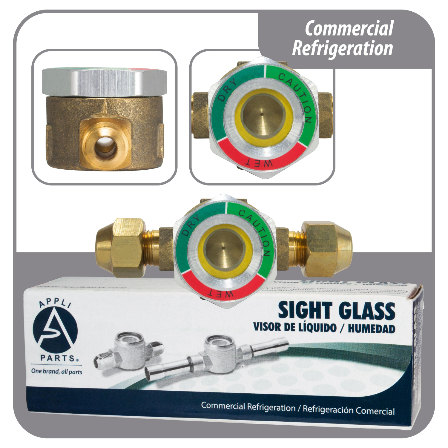 Appli Parts Sight Glass liquid moisture indicator with 1/4 x 1/4 in Flare connections take-apart body type suitable for CFC HCFC HFC refrigerants APSG-14 Use: For refrigeration, Air conditioning and Heating applications Universal: Will replace any brand with similar characteristics Specs: Solid brass body 3 inch long with Flare 1/4 in connections Quality: All our products are designed and manufactured following very strict procedures and high quality standards during their manufacture. An optimal selection of materials is made, combined with research and development procedures, which guarantee the durability and performance of each manufactured product, offering our customers the same efficiency expected from an original part Replaces: SA-12 ALM-1MM2 PSG-2 SGN 6 HMI-1MM2 VIS-14