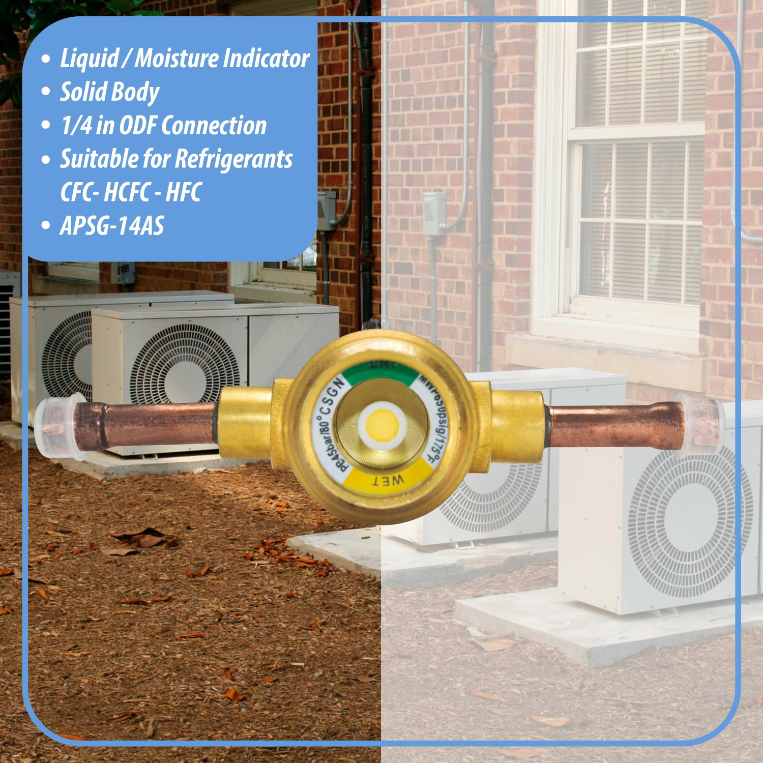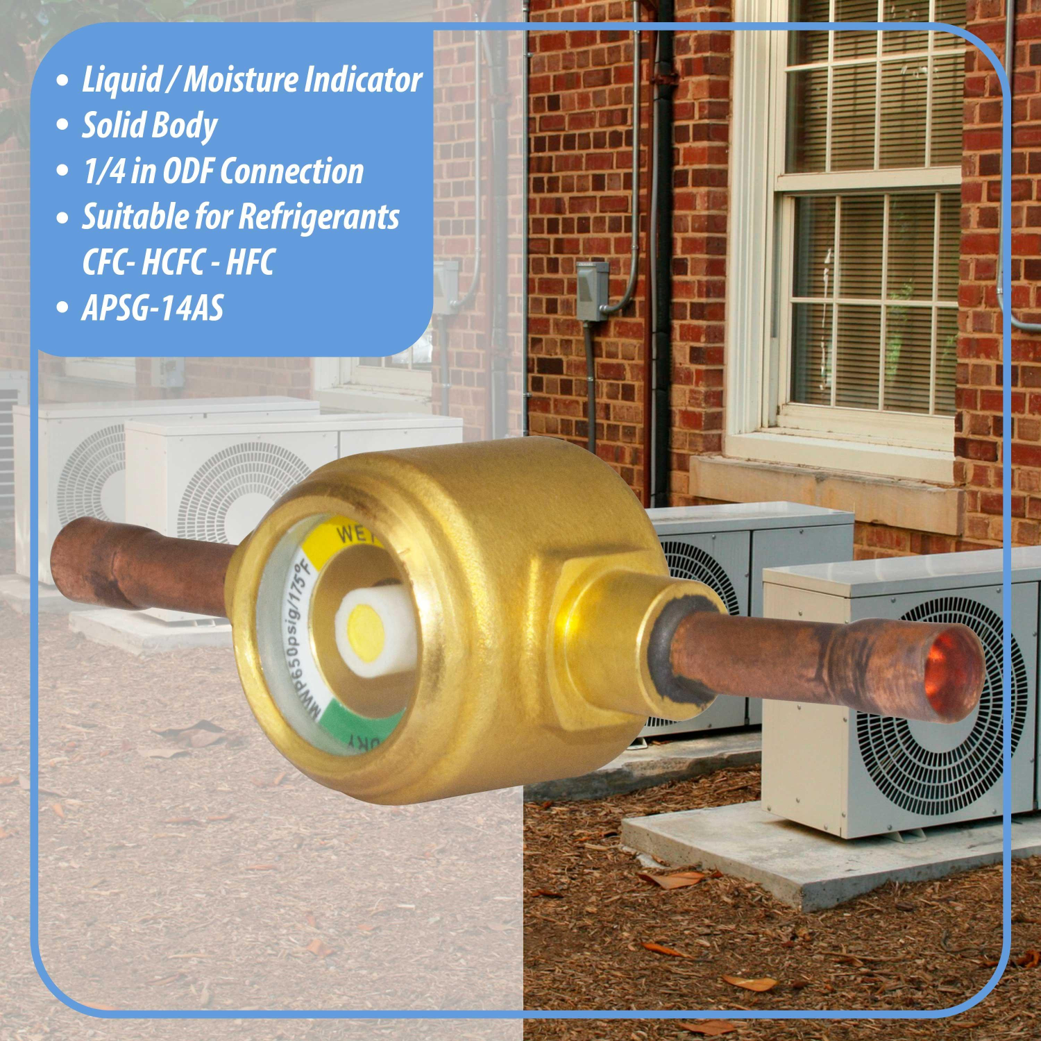 Appli Parts Sight Glass liquid moisture indicator with 1/4 x 1/4 in ODF solder connections with Solid Body suitable for CFC HCFC HFC refrigerants APSG-14AS