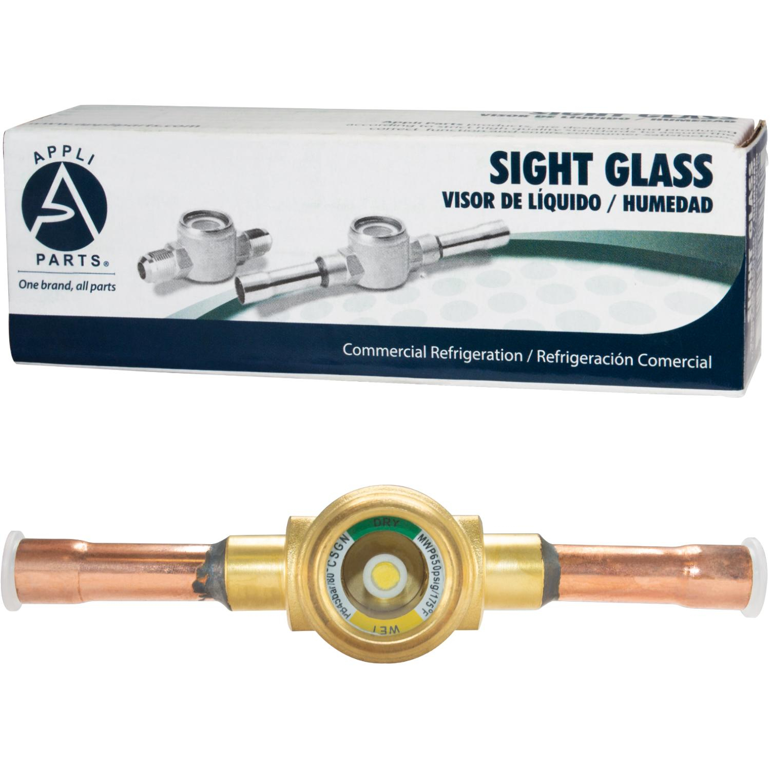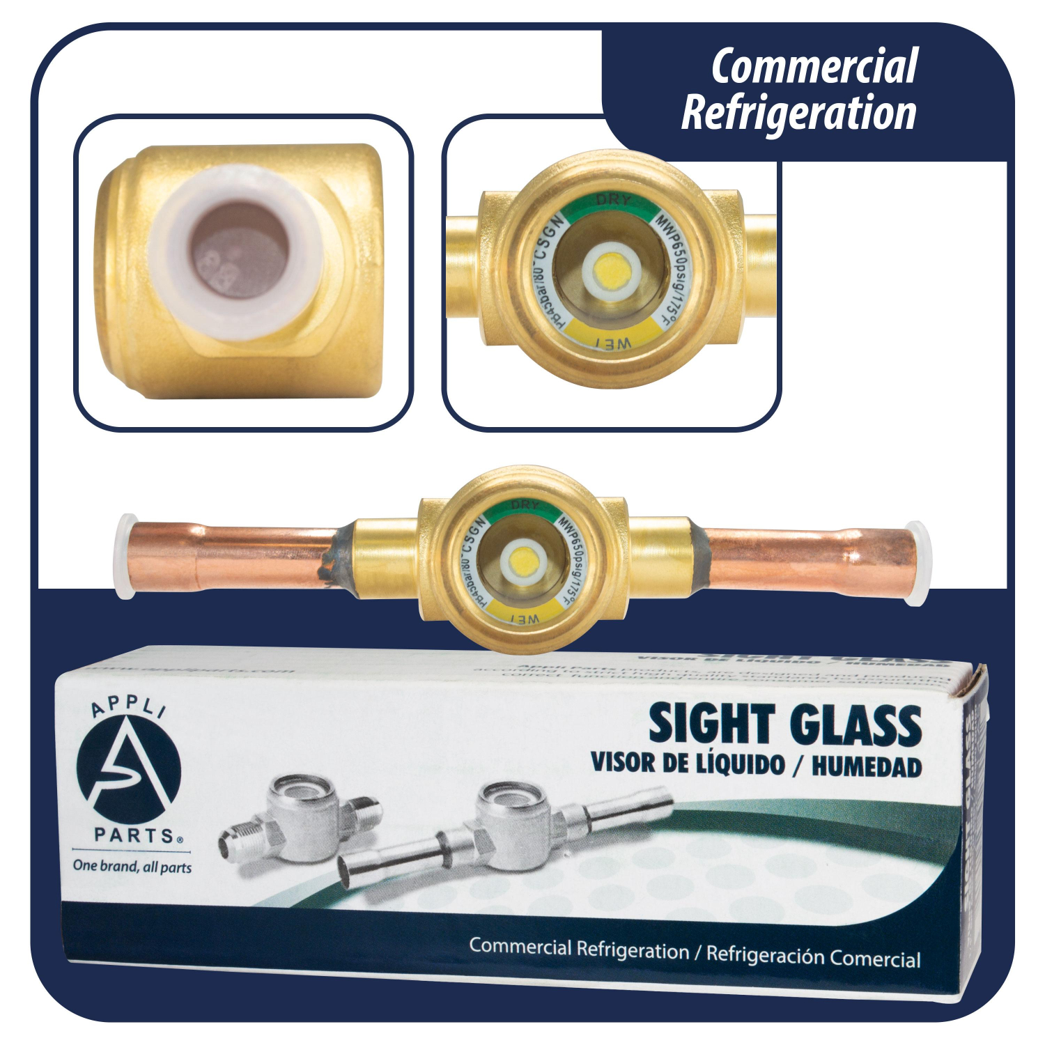 Appli Parts Sight Glass liquid moisture indicator with 3/8 x 3/8 in ODF solder connections with Solid Body suitable for CFC HCFC HFC refrigerants APSG-38AS Use: For refrigeration, Air conditioning and Heating applications Universal: Will replace any brand with similar characteristics Specs: Solid brass body 4-3/4 inch long with ODF 3/8 in connections Quality: All our products are designed and manufactured following very strict procedures and high quality standards during their manufacture. An optimal selection of materials is made, combined with research and development procedures, which guarantee the durability and performance of each manufactured product, offering our customers the same efficiency expected from an original part Replaces: SA-13S ALM-1TT3 PSG-3S SGN 10s HMI-1TT3