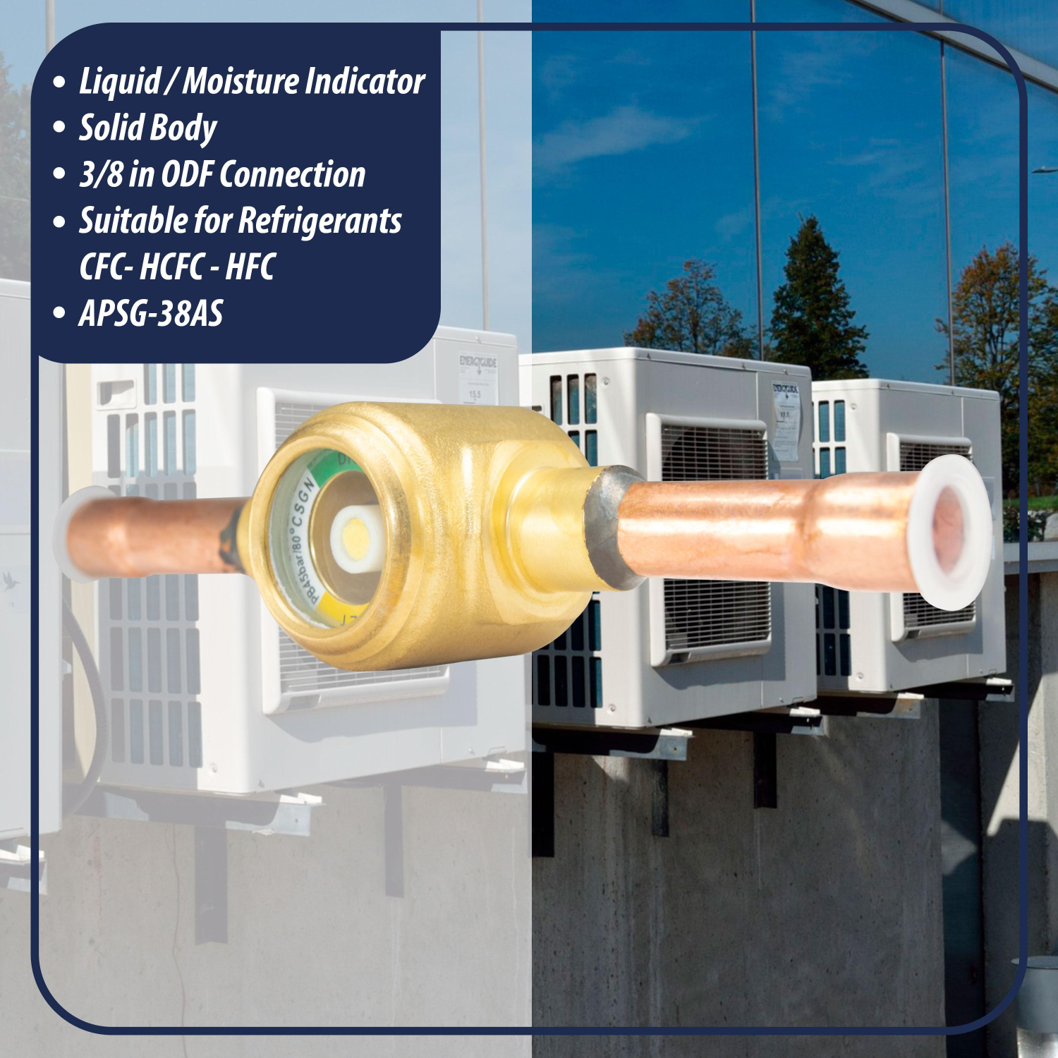 Appli Parts Sight Glass liquid moisture indicator with 3/8 x 3/8 in ODF solder connections with Solid Body suitable for CFC HCFC HFC refrigerants APSG-38AS