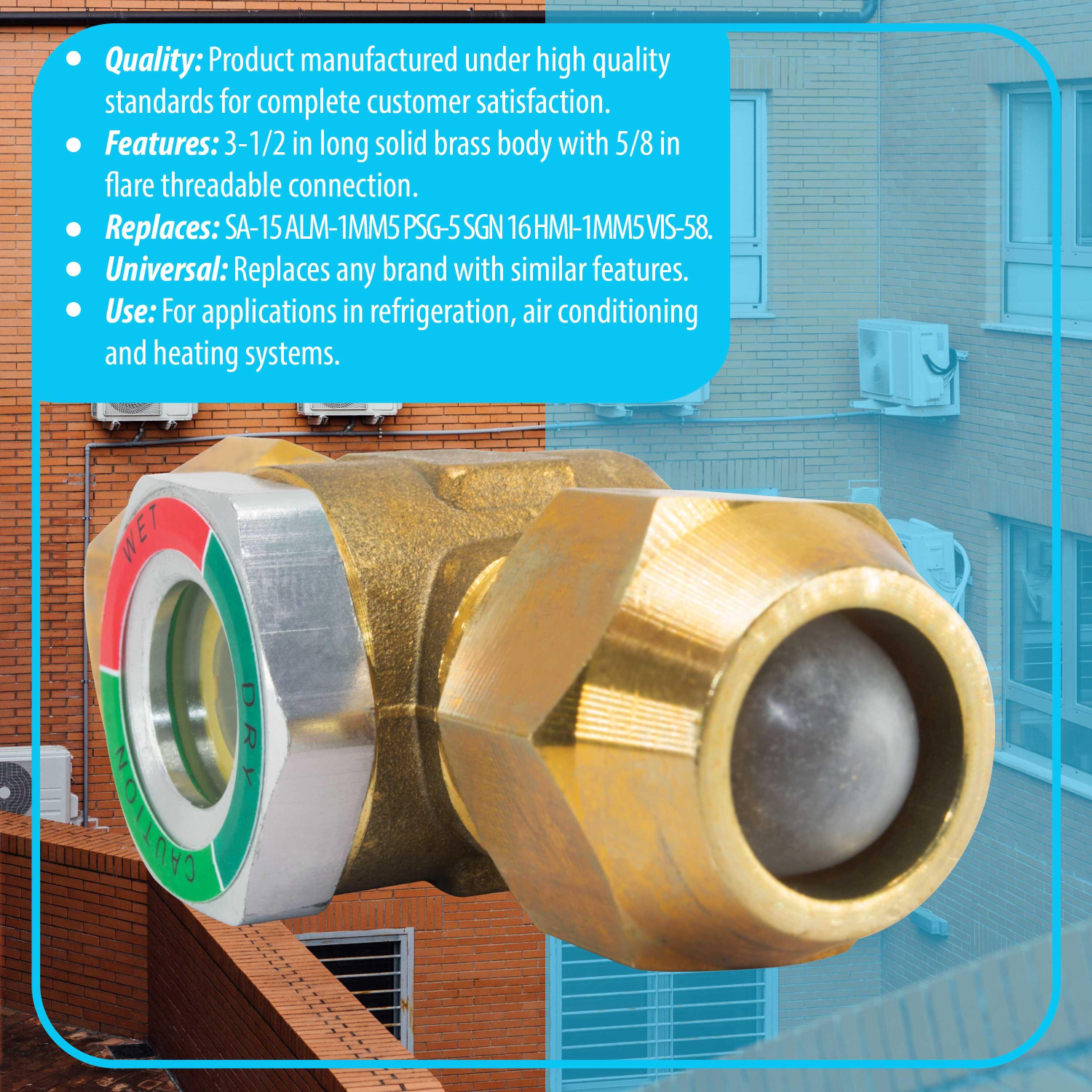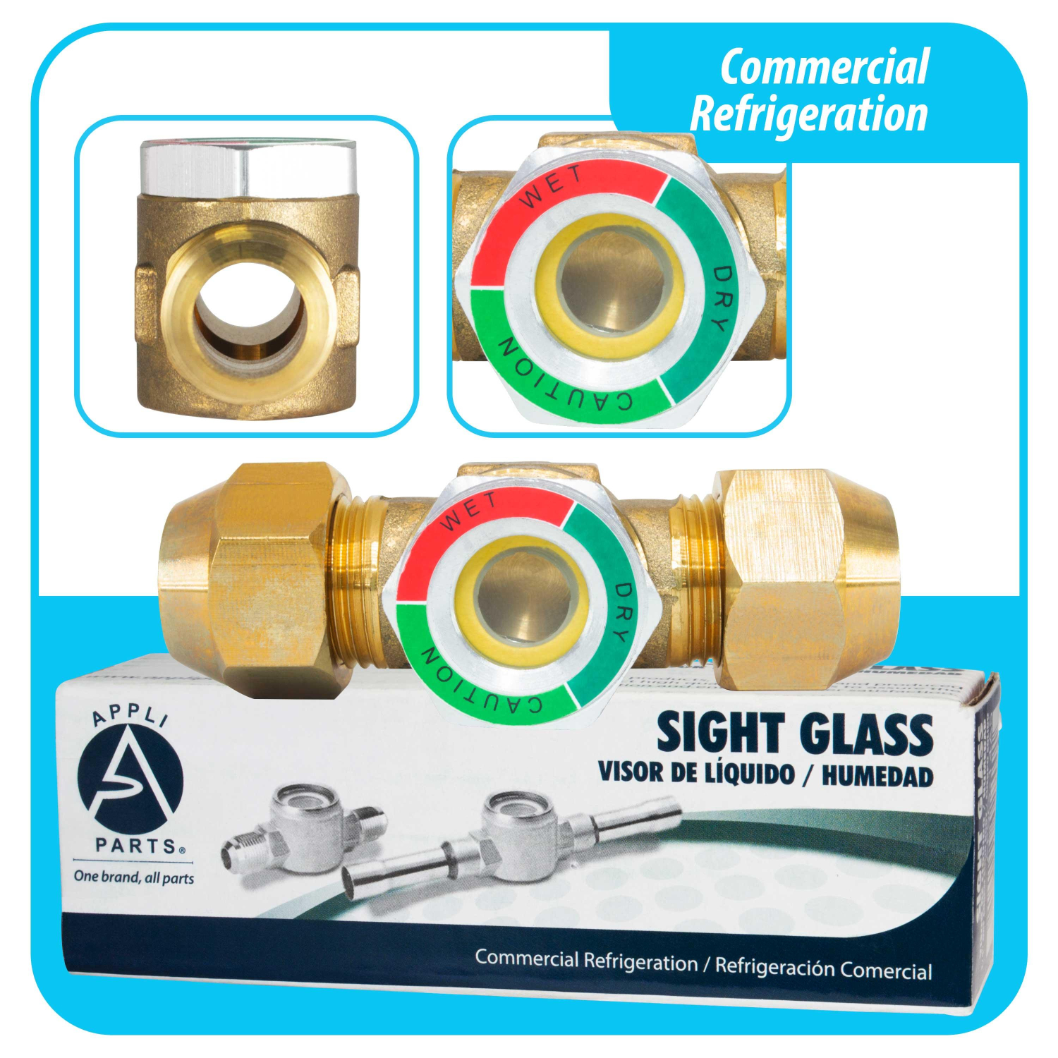 Appli Parts Sight Glass liquid moisture indicator with 5/8 x 5/8 in Flare connections take-apart body type suitable for CFC HCFC HFC refrigerants APSG-58 Use: For refrigeration, Air conditioning and Heating applications Universal: Will replace any brand with similar characteristics Specs: Solid brass body 3-1/2 inch long with Flare 5/8 in connections Quality: All our products are designed and manufactured following very strict procedures and high quality standards during their manufacture. An optimal selection of materials is made, combined with research and development procedures, which guarantee the durability and performance of each manufactured product, offering our customers the same efficiency expected from an original part Replaces: SA-15 ALM-1MM5 PSG-5 SGN 16 HMI-1MM5 VIS-58