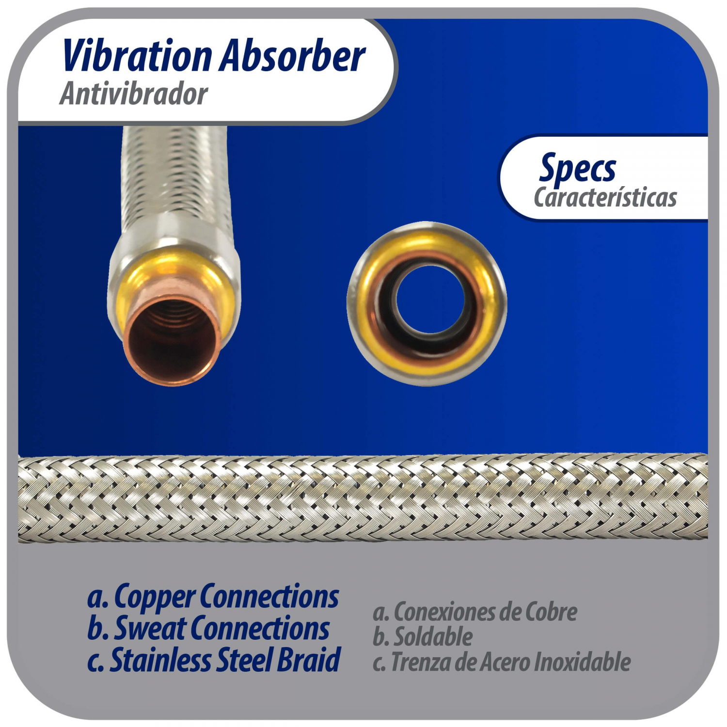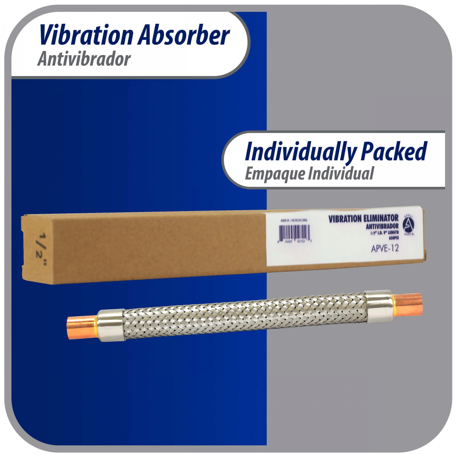 Appli Parts Vibration Absorber eliminator with 1/2 in sweat connections 9 in Long 500psi max working and 3,265psi burst pressure APVE-12 Use: For Refrigeration and Air conditioning systems Specs: 1/2 in sweat connection, stainless steel braid, 3,265psi burst pressure Refrigerants: Compatible with CFC HCFC and HFC. Not to be used with amonia Application: Use to reduce and eliminate vibration noise from the systems and avoid loose fitings and joints. Compatible with any brand of refrigeration or AC system Quality: All our products are designed and manufactured following very strict procedures and high quality standards during their manufacture. An optimal selection of materials is made, combined with research and development procedures, which guarantee the durability and performance of each manufactured product, offering our customers the same efficiency expected from an original part