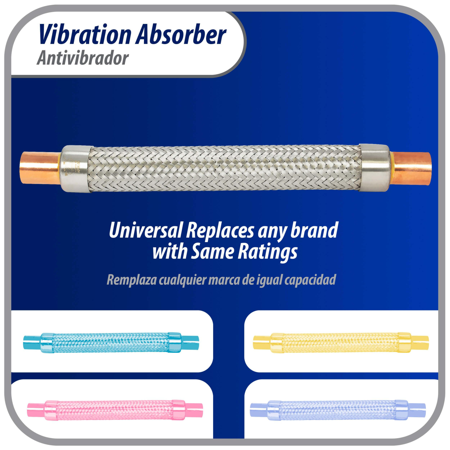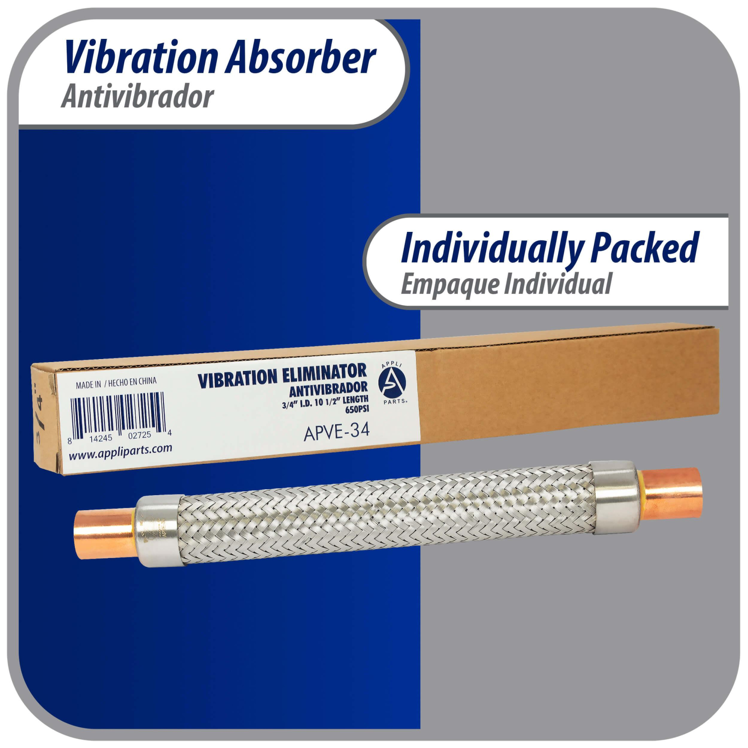 Appli Parts Vibration Absorber eliminator with 3/4 in sweat connections 10 in Long 450psi max working and 3,265psi burst pressure APVE-34 Use: For Refrigeration and Air conditioning systems Specs: 3/4 in sweat connection, stainless steel braid, 3,265psi burst pressure Refrigerants: Compatible with CFC HCFC and HFC. Not to be used with amonia Application: Use to reduce and eliminate vibration noise from the systems and avoid loose fitings and joints. Compatible with any brand of refrigeration or AC system Quality: All our products are designed and manufactured following very strict procedures and high quality standards during their manufacture. An optimal selection of materials is made, combined with research and development procedures, which guarantee the durability and performance of each manufactured product, offering our customers the same efficiency expected from an original part