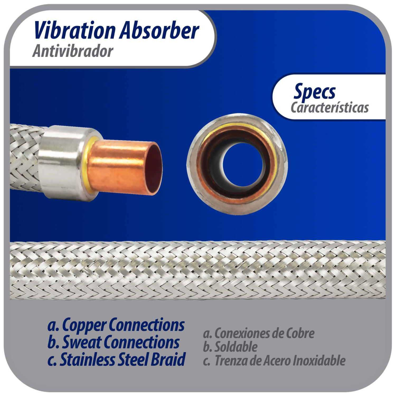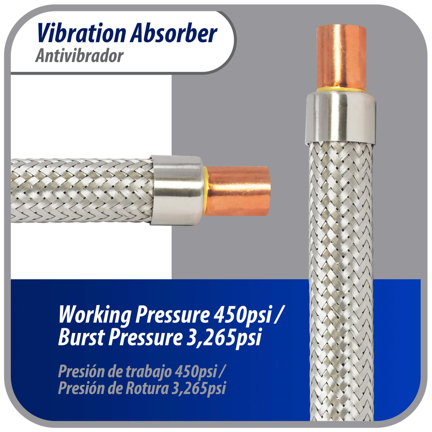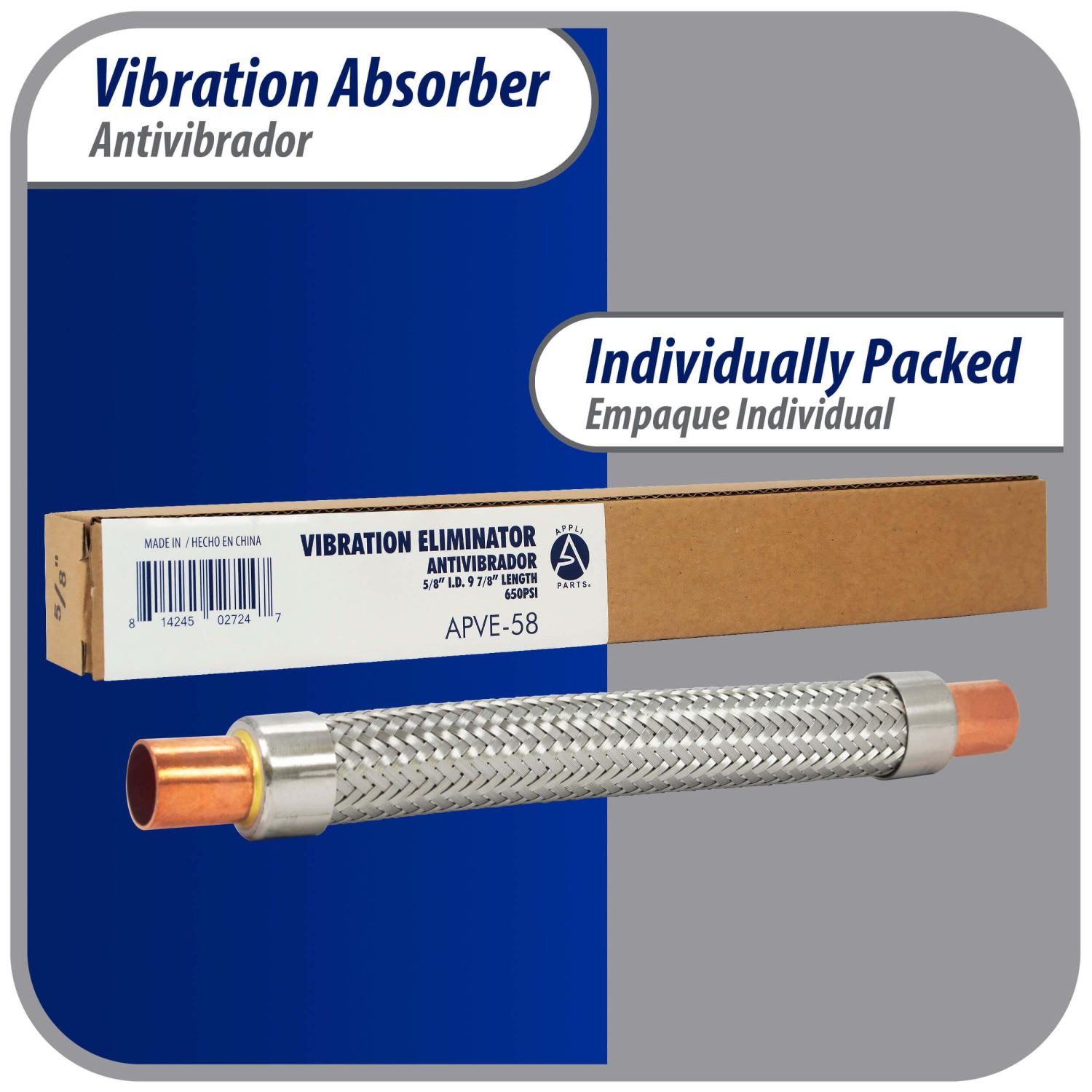Appli Parts Vibration Absorber eliminator with 5/8 in sweat connections 9-3/4 in Long 450psi max working and 3,265psi burst pressure APVE-58 Use: For Refrigeration and Air conditioning systems Specs: 5/8 in sweat connection, stainless steel braid, 3,265psi burst pressure Refrigerants: Compatible with CFC HCFC and HFC. Not to be used with amonia Application: Use to reduce and eliminate vibration noise from the systems and avoid loose fitings and joints. Compatible with any brand of refrigeration or AC system Quality: All our products are designed and manufactured following very strict procedures and high quality standards during their manufacture. An optimal selection of materials is made, combined with research and development procedures, which guarantee the durability and performance of each manufactured product, offering our customers the same efficiency expected from an original part
