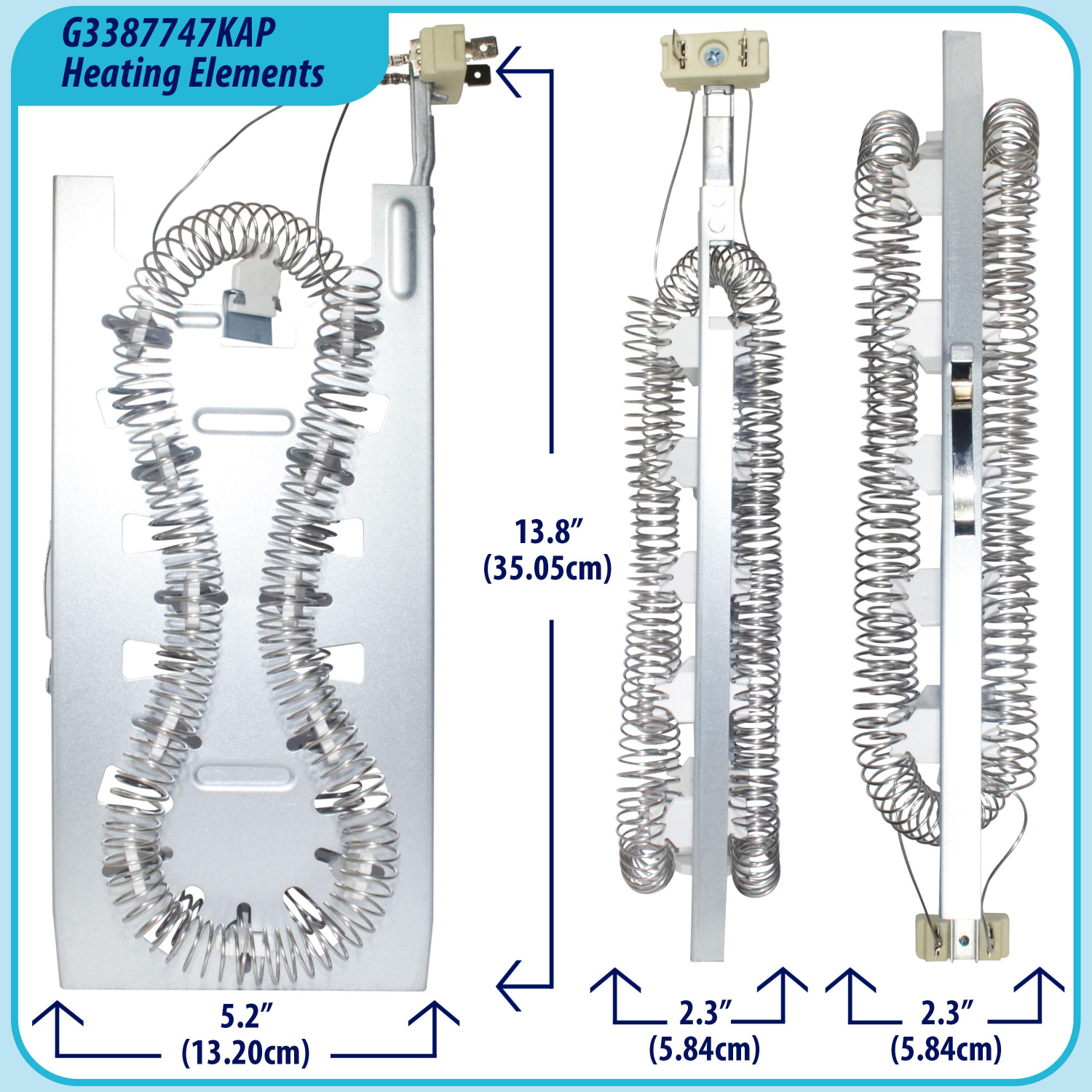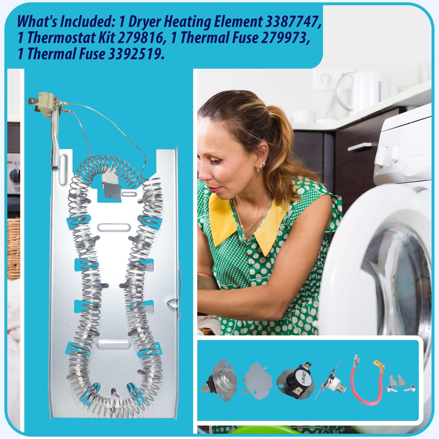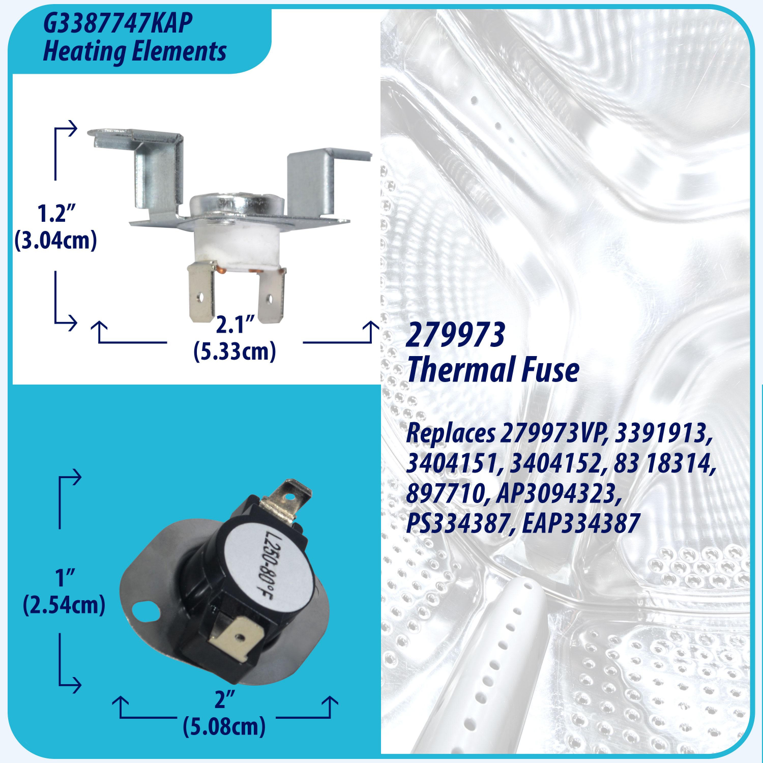Kit: Includes replacements for original part numbers 1 Dryer Heating Element 3387747, 1 Thermal Fuse 3392519, 1 High Limit Thermostat 279816 and 279973Multibrand: The heating element Replacement 3387747 fits most top name brands such as Whirlpool, Kenmore, Maytag, Kitchen-aid, Roper, Samsung, LG, Sears and many other appliances with electric heating. This product is not designed nor intended for gas dryersQuality: The Non-Original parts we offer as a replacement of the OEM parts are intended to satisfy and exceed quality expectations. The manufacturing process begins with the selection of high grade materials combined with research and development procedures to ensure the durability and performance of each elementQuick Heating: The nickel-chromium coiled wire of the heating element receives and resists a controlled electric dryer current, which is designed to heat up to quickly to provide stable temperature for a faster and more reliable drying cycle. The temperature is controlled by the Thermal Fuse and Thermostats that act as safety features to avoid overheatingReplacement: Kit includes the following parts and replacements 3387747AP replaces WP3387747, 80003, 3387747 and W11045584. Part 279816AP replaces 3399848, 3977393, 312968, 84f44, L250-80F. Part 279973AP replaces 3391913, 3404151, 3404152, 3977395, 8318314 and Part 3392519 replaces ET401, 3388651, 694511, 80005, 3392519, 6l4101091C, G4AP0500Weight : 1.4 LBR