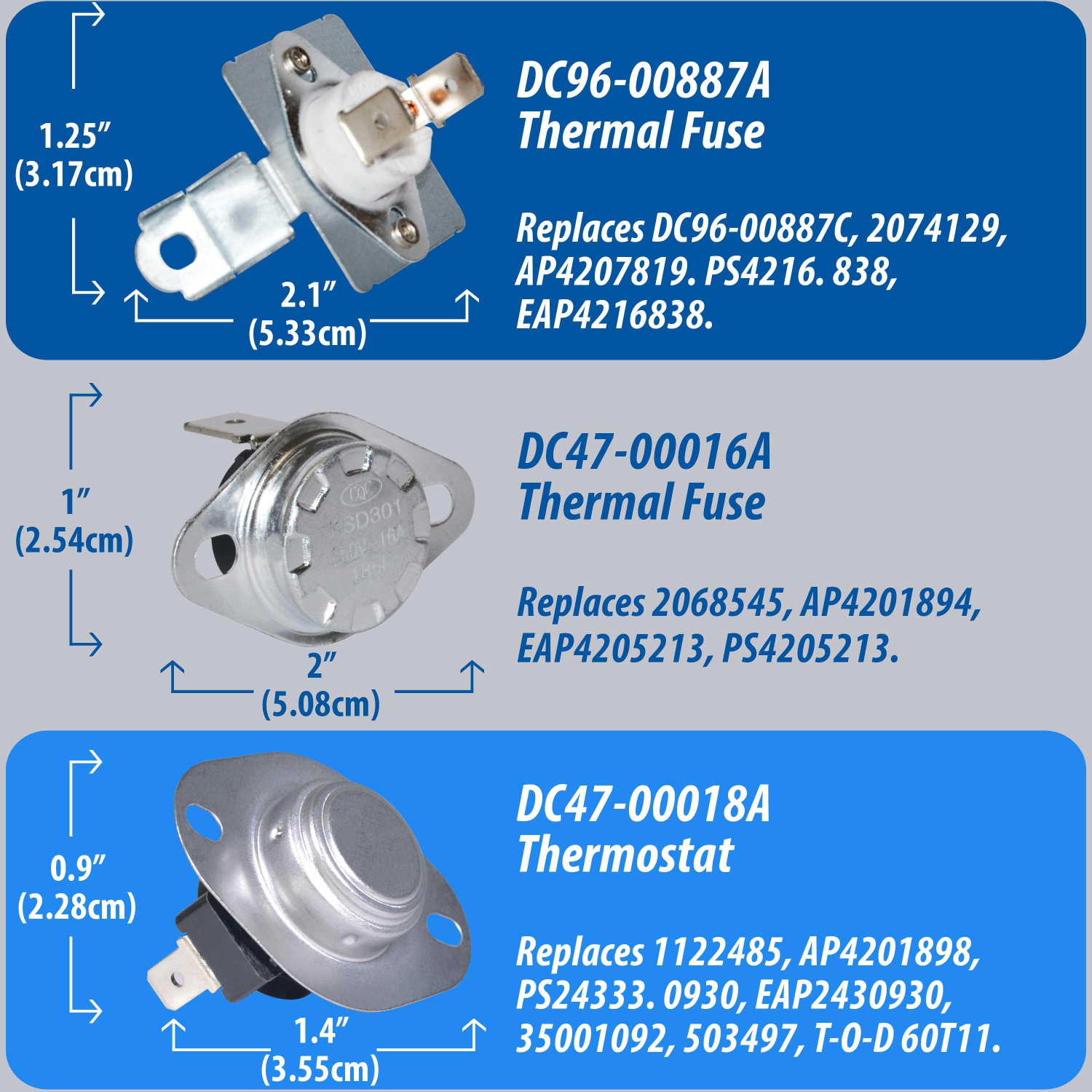 Kit: Includes replacements for 1 Dryer Heating Element DC47-00019A, 1 Thermal Fuse DC96-00887A and 1 DC47-00016A, 1 High Limit Thermostat DC47-00018AMultibrand: The heating element Replacement DC47-00019A fits most top name brands. This product is not designed nor intended for gas dryersQuality: The Non-Original parts we offer as a replacement of the OEM parts are intended to satisfy and exceed quality expectations. The manufacturing process begins with the selection of high grade materials combined with research and development procedures to ensure the durability and performance of each element.Quick Heating: The nickel-chromium coiled wire of the heating element receives and resists a controlled electric dryer current, which is designed to heat up to quickly to provide stable temperature for a faster and more reliable drying cycle. The temperature is controlled by the Thermal Fuse and Thermostats that act as safety features to avoid overheating.Replacement: Kit includes the following parts and replacements DC47-00019A replaces 35001247, 35001119, AP4045884, 1185561, AH2038533, EA2038533, ERDC47-00019A, PS2038533, 2068550. DC96-00887A replaces DC96-00887C, PS2038484 and AP4207819. DC47-00016A replaces WP35001087, 35001087, AP4201894 and PS2038378. DC47-00018A replaces WP35001092, 35001092, PS2038383, AP4201898, AP4201899 and 35001092Weight : 1.2 LBR