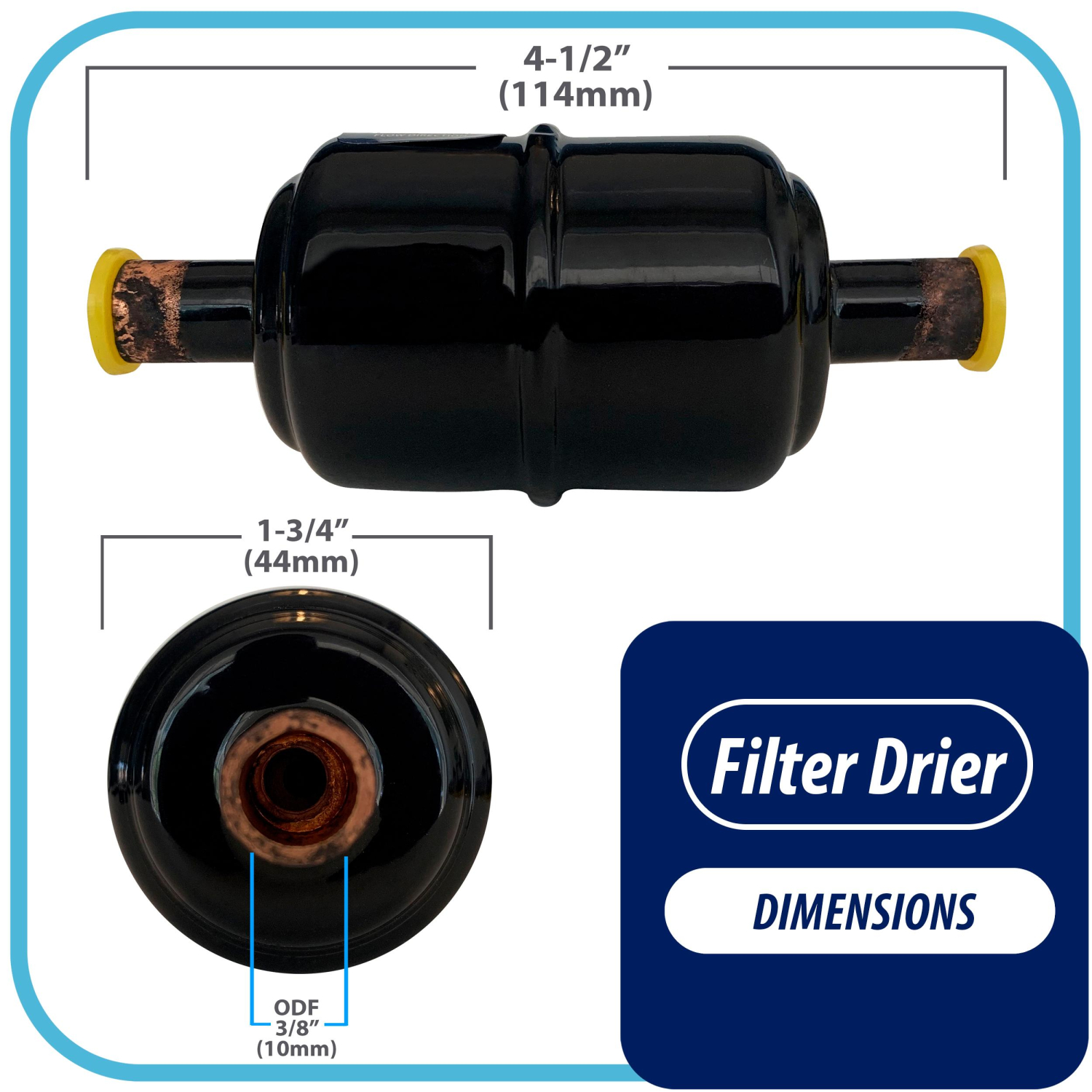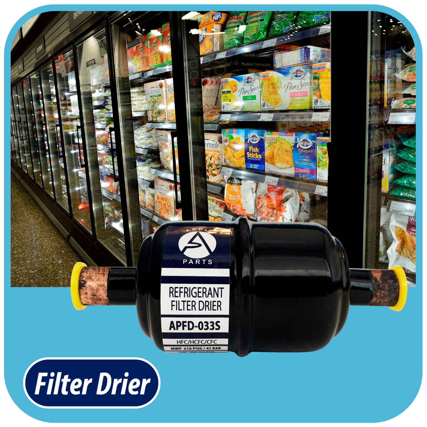Appli Parts liquid line refrigerant ac filter dryer hvac refrigeration 033S 3/8 in ODF sweat solder connection universal unidirectional 4-1/2 in long 1-3/4 in wide APFD-033S