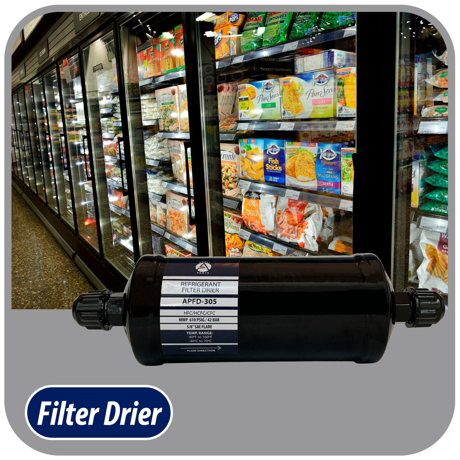 Appli Parts liquid line refrigerant ac filter dryer hvac refrigeration 305 5/8 in SAE Flare connection universal unidirectional 10-1/2 in long 3-1/4 in wide APFD-305