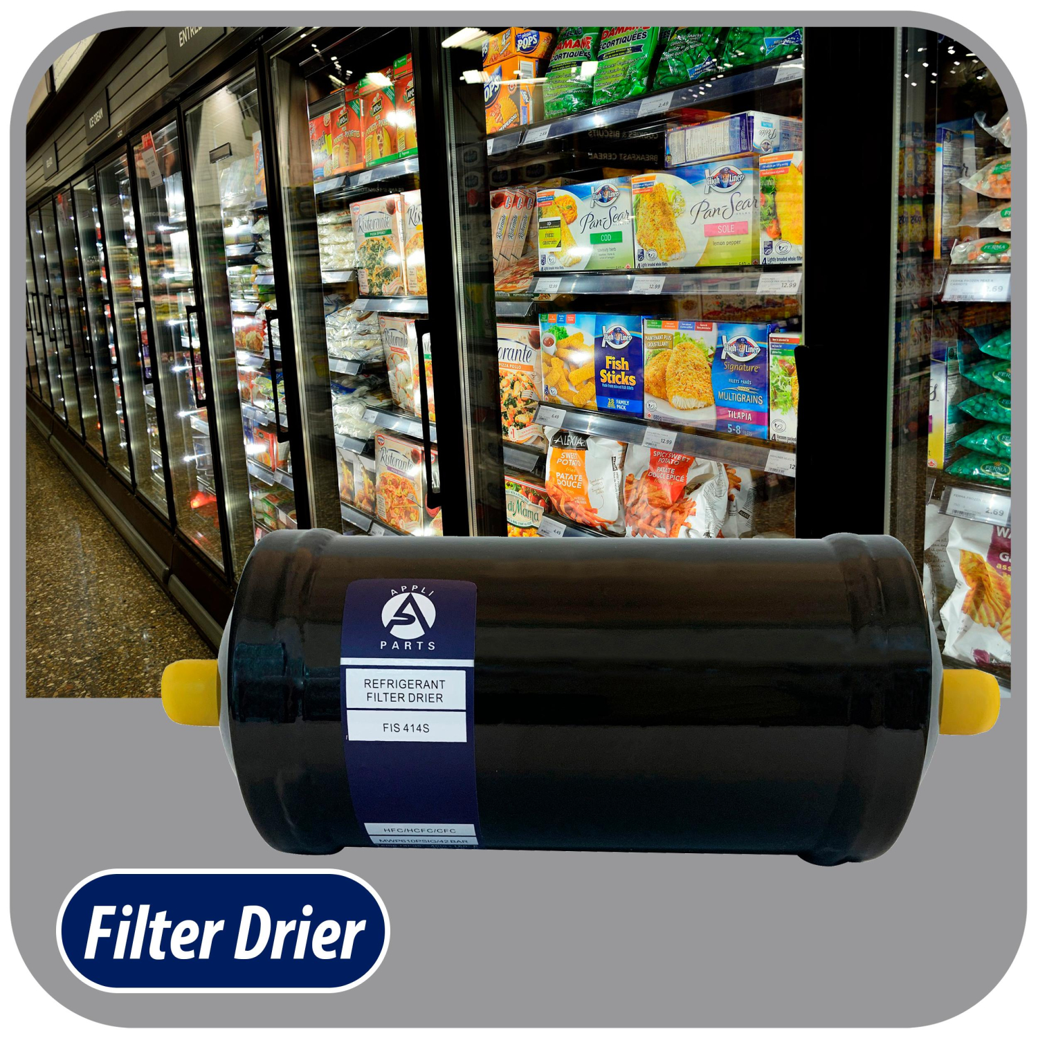 Appli Parts liquid line refrigerant ac filter dryer hvac refrigeration 414S 1/2 in ODF Sweat connection universal unidirectional 9-1/2 in long 3-1/2 in wide APFD-414S Universal: Simple drop-in replacements for most driers installed in refrigeration, air conditioning and heat pump units refrigerant line Details: Designed to protect HVAC/R systems from acid and humidity. Max temperature 160F (70C) min temperature -40F (-40C) Core: 100% Solid molecular sieve core to assure complete humidity removal. Refrigerants: Works with most refrigerants including r1234yf, r134a, r290, r22, r407c, r404a, r507a, r600 and many more Replaces: Dml-414S, Ff 414S, Dryl414S, Dcl 414S, Adk414S, Sd-414, C-414-S, Wah414S Quality: All our products are designed and manufactured following very strict procedures and high quality standards during their manufacture. An optimal selection of materials is made, combined with research and development procedures, which guarantee the durability and performance of each manufactured product, offering our customers the same efficiency expected from an original part