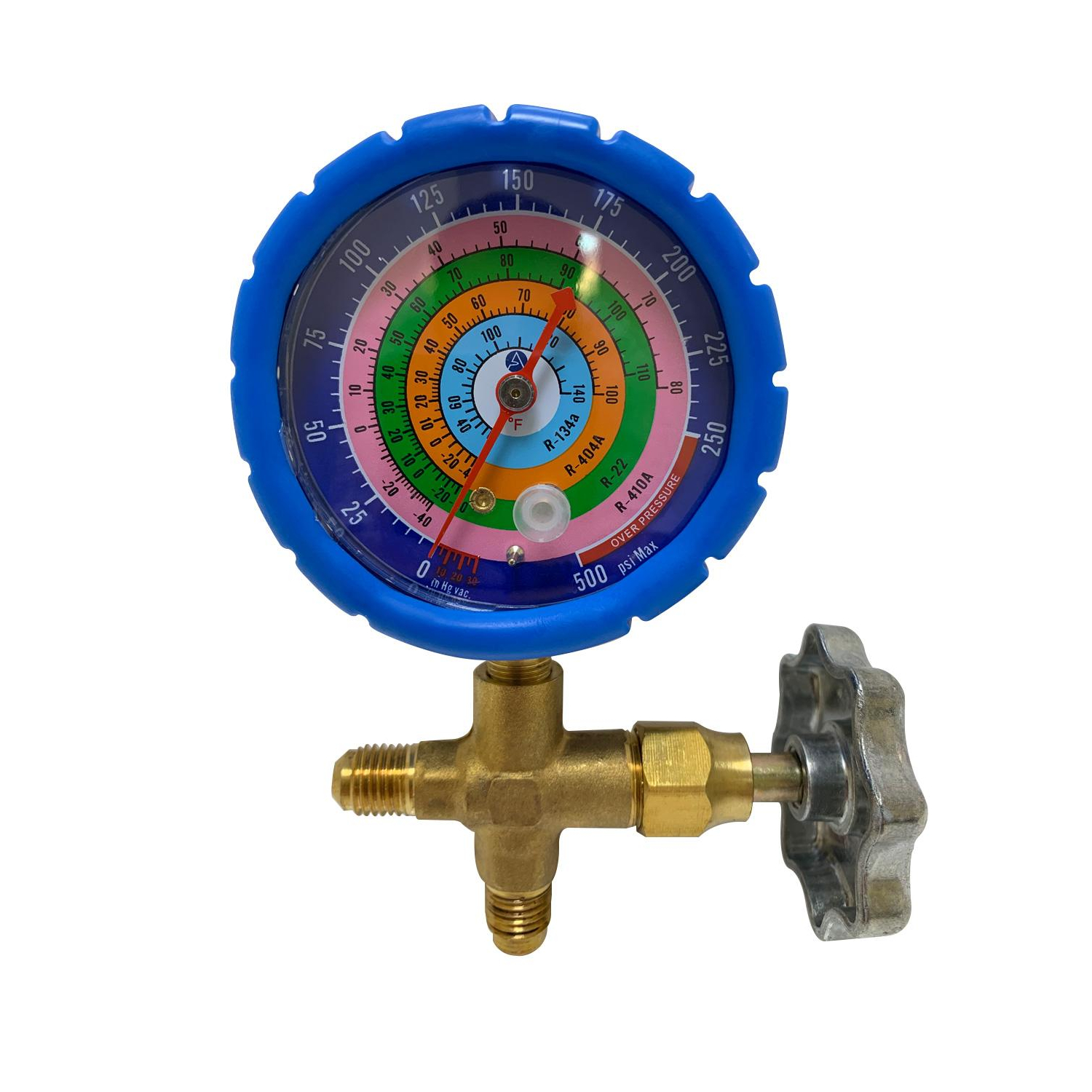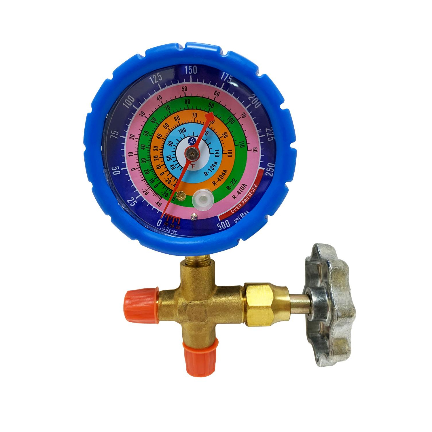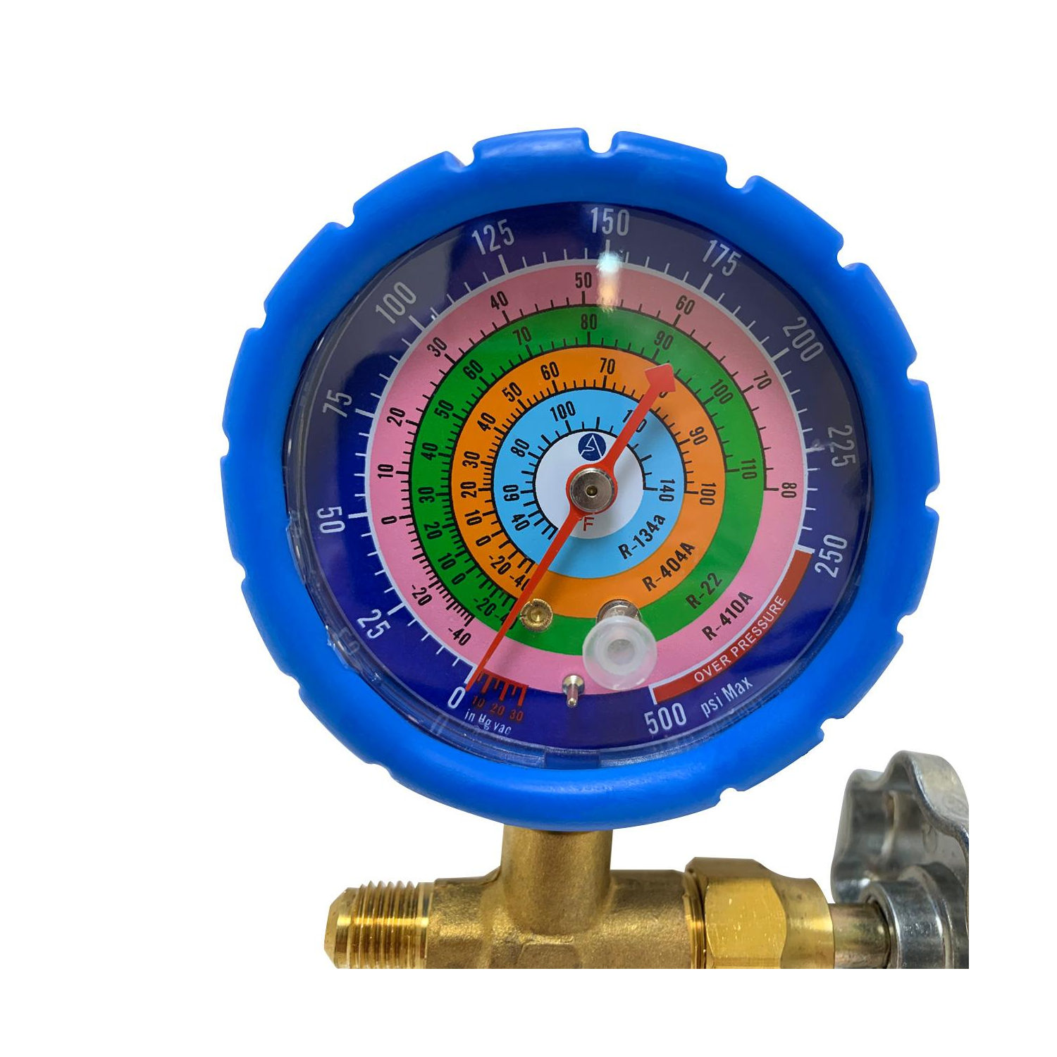 Appli Parts Analog Single Manifold Low Pressure R134/R22/R404/R410 Pressure psi Temperature Fahrenheit Scales APMG-A3L Construction: Solid Brass Body, Aluminum Alloy Gauge With Protective Rubber Use: For Charging And Servicing Lo Pressure A/C And Refrigeration Systems Scales: Pressure Scale: Psi -30 To 500. Temperature Scale: Fahrenheit -40 To +140 Includes: low pressure manifold, analog, with protective rubber cover and 2 connection ports for SAE 1/4 inch, compatible with refrigerant R134 / R22 / R404 / R410. The temperature scale is in Fahrenheit and the pressure scale is in PSI, model APMG-A3L Quality: Our products are manufactured to OEM quality standards to fit as an exact replacement for other brands on the market, but with the same performance as the original product, high quality construction suitable for professionals and DIYers