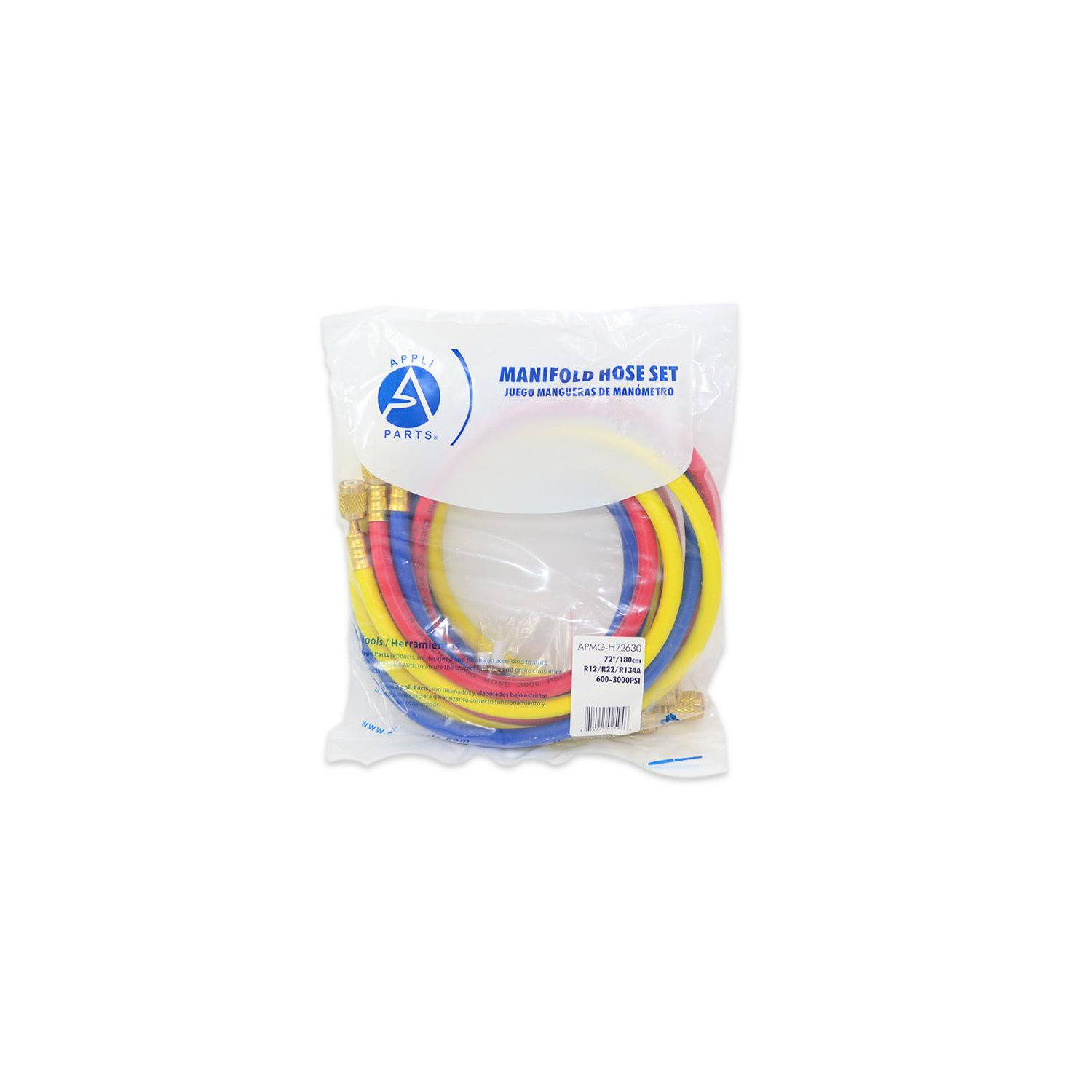 Appli Parts Refrigerant hoses for use with HVAC Manifold gauges 72in Long 1/4in SAE for R22/R134 600-3000psi for Charging servicing refrigeration systems APMG-H72630 Construction: Made of High Density rubber covered with Neoprene Coat for additional Protection and Durability. Brass connectors with Silicone seals and depressor Details: These HVAC hoses come with 1/4in SAE female flare couplers. One end with angled 45 degree Finish for easier Connecting. 72in long suitable for multiple refrigerants. R12 R22 R134a R502 Includes: Set Includes 72 Inch Hoses, Red intended for High pressure, Blue intended for Low Pressure and Yellow for Vacuum and Charging Refrigerant. Additional Silicone seal replacement kit Specification: Rated for 600 Psi Max Working Pressure, Tested to 3000 Psi Burst Pressure. High quality crimped brass connectors providing additional durability. Use: Compatible with All Refrigeration and AC Systems Manifold Sets with a 1/4 SAE Connection. When used for Vehicle AC Systems Charging Adapters are needed. Sold separately