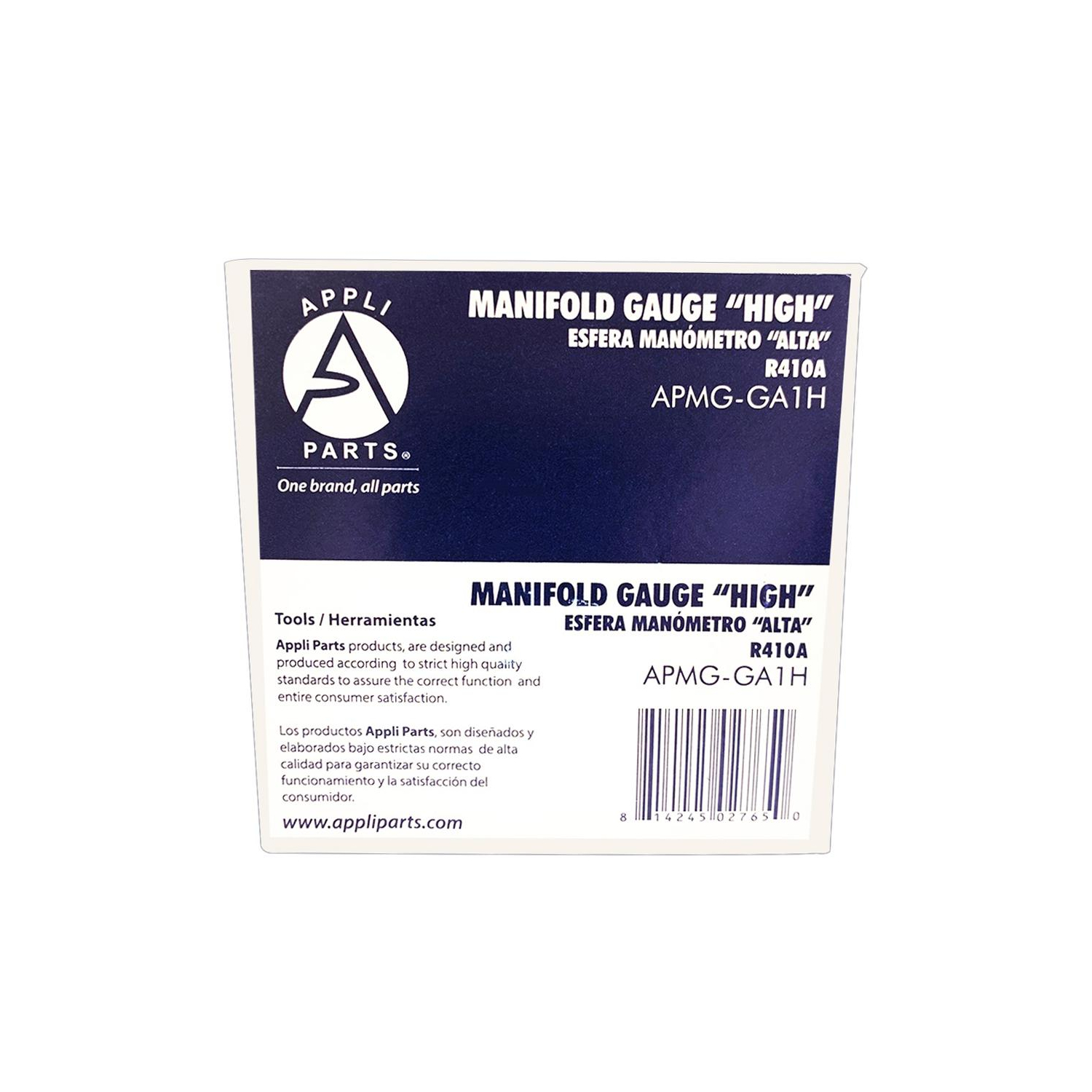 Appli Parts Replacement Manifold Gauge for High Side R410 Pressure Scales KPa psi Temperature Scales Fahrenheit and Celsius 1/4in SAE APMG-GA1H Construction: Made From Aluminum Alloys, Plastic Scratch Resistance Cover And Rubber Boot Use: Replacement Gauge Rated For R-410A Air Conditioning Applications Scales: Dual Pressure Scale: Kpa 0 To 5500 And Psi 0 To 800. Dual Temperature Scale: Fahrenheit +20 To +160 Hi And Celsi Includes: Manifold Gauge With Rubber Protection Boot Includes: Manifold Gauge With Rubber Protection Boot