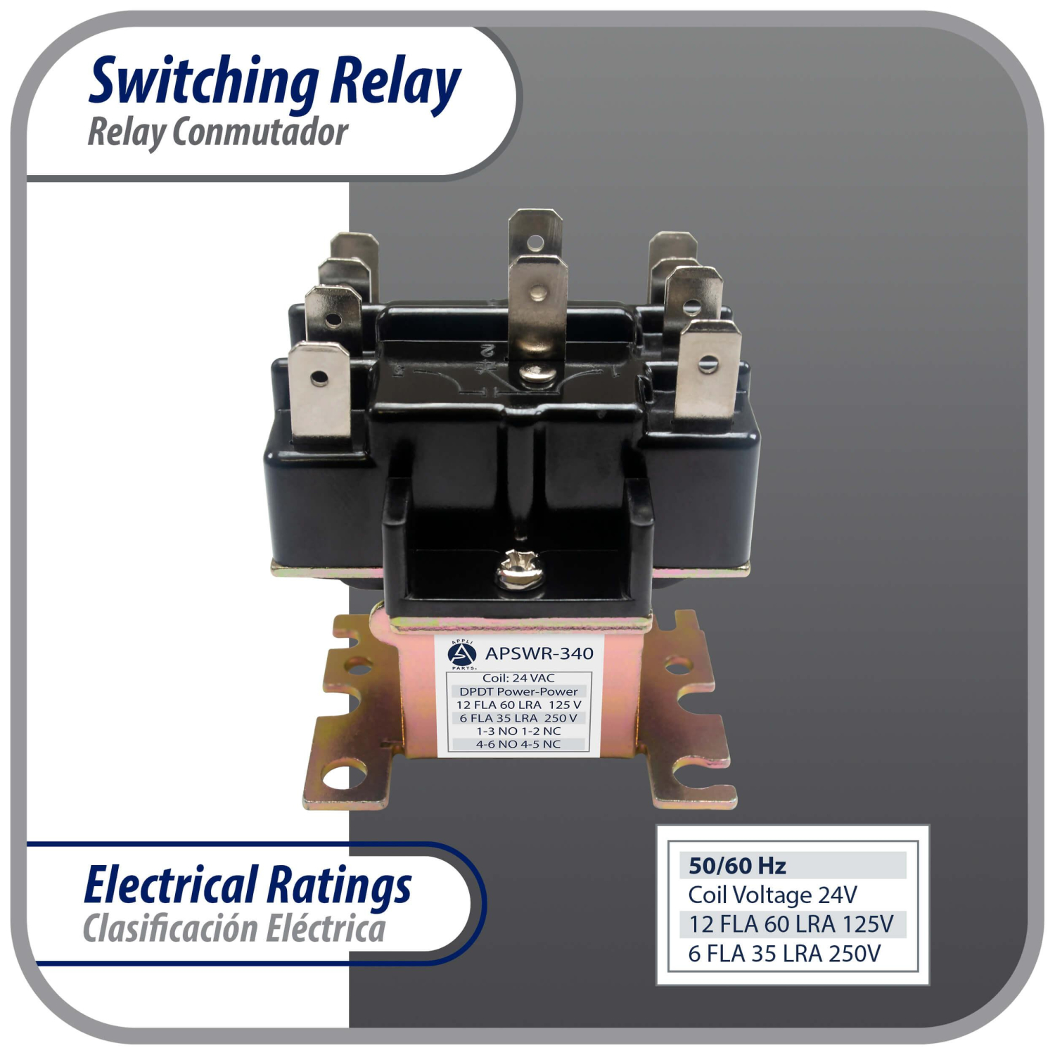 90340 Appli Parts General Purpose Switching Relay Double Pole Double Throw 24VAC Coil for HVAC applications and other general electrical installations APSR-340