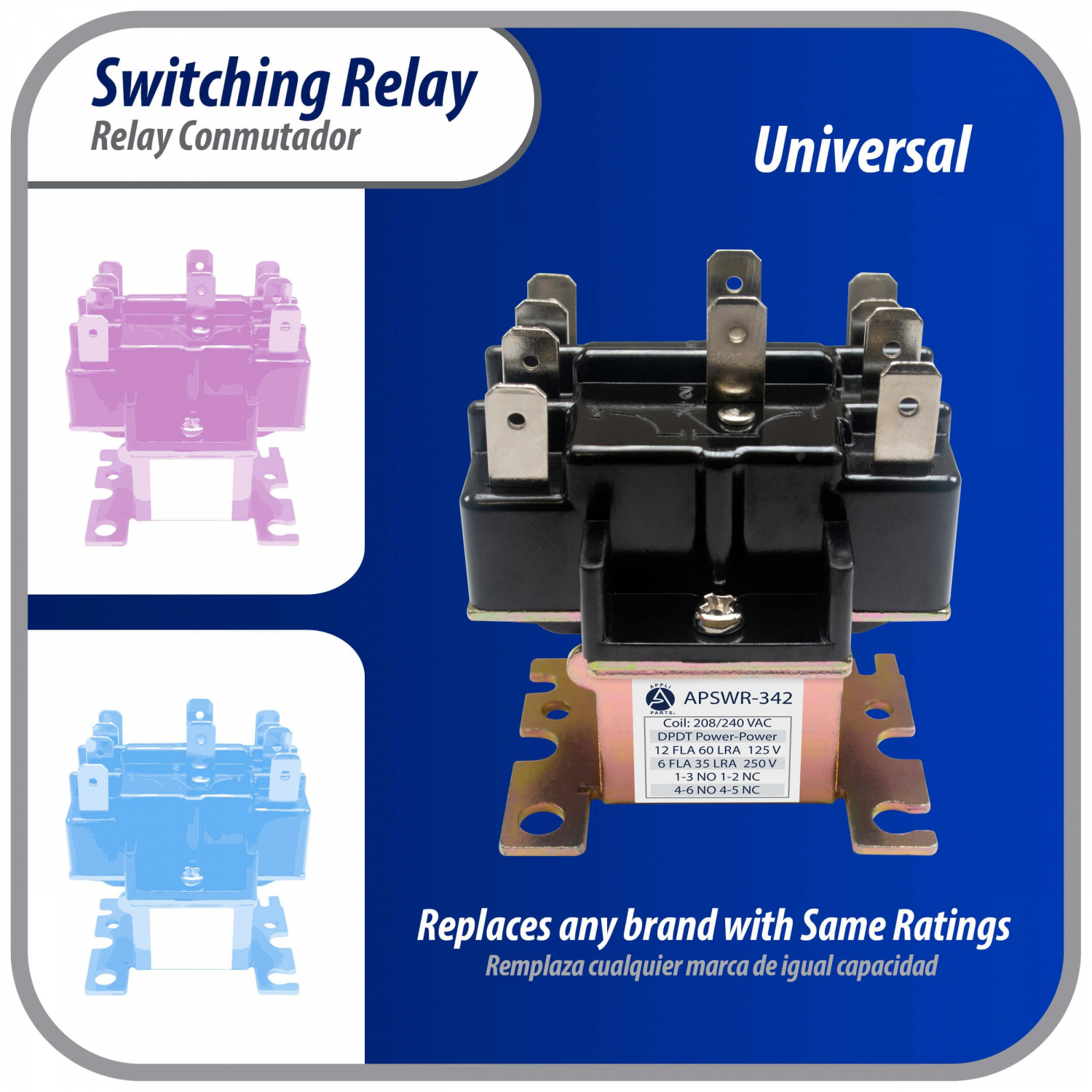 90342 Appli Parts General Purpose Switching Relay Double Pole Double Throw 208-240VAC Coil for HVAC applications and other general electrical installations APSR-342 Use: For Hvac/R typically used to control the Fan motor in the air handler unit of the Air conditioning system. Can also be used for other electrical applications Details: Coil Voltage is 208-240 Volts. 2 sets of Terminal Power 1-2-3 where 1-3 is NO and 4-5-6 where 4-6 is NO. Double Pole Double Throw Switch. 12 FLA 60 LRA at 125V and 6 FLA 35 LRA at 250V Universal: Will Replace any Switching Relay with the same specifications to work with any brand of motor or other electrical applications where needed Quality: Our products are manufactured following High Quality Standards to comply with international certifications and performance expected from Original manufactured equipment Replaces: This product is a direct replacement for Jard 92342, RBM 90-342, White-Rodgers 90-342, Mars 90342, Honeywell R4222D1021, Supco 90342, Packard PR342, 90-112, Zettler ZC90342