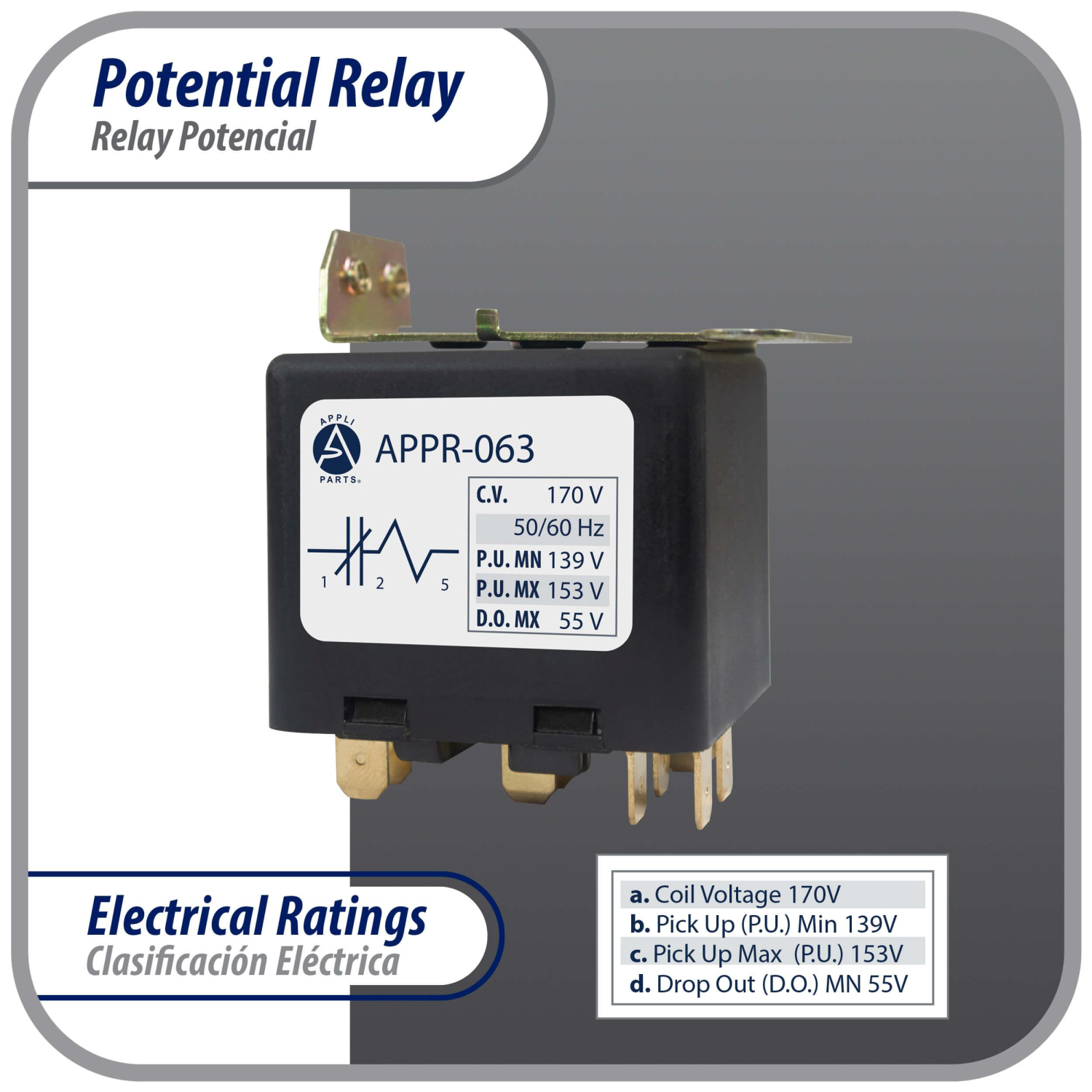 Appli Parts Potential Relay 063 Coil Voltage 170V Min Pick up 139V Max Pick up 153V Max Drop Out 55V 50/60 Hz Universal replacement for HVAC and Refrigeration units APPR-063
