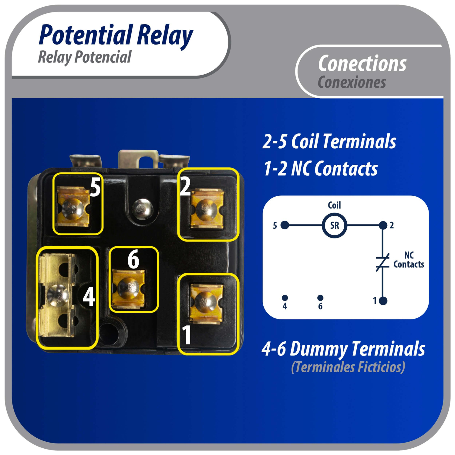 Use: Potential Relays are used to engage and disengage the Start Capacitor once the unit is started. Failing to disconnect the Start capacitor will cause electrical damageSpecs: Coil Voltage is 332V. Minimum Pick Up 168V. Maximum Pick Up 182V. Maximum Drop Out 90V. Can be used in 50/60 Hz applicationsConnections: There are 6 sets of 1/4in connectors. 1-2 Normally Closed Contacts. 2-5 Coil Terminals. 4-6 Dummy TerminalsUniversal: Replaces many part numbers and brands with the same electrical specs.Replaces: 9065, 19004, 19165 90-3, 90-7, 90-40, 90-65, 040-0001-02, 040-0001-11, 82778Weight : 0.4 LBR