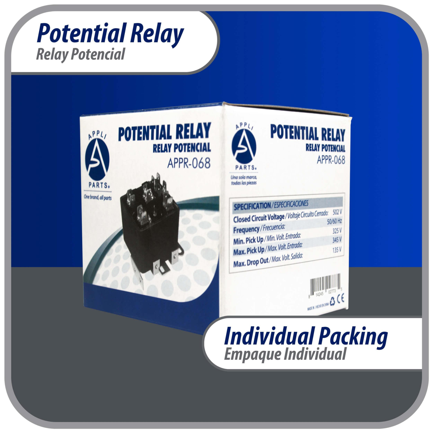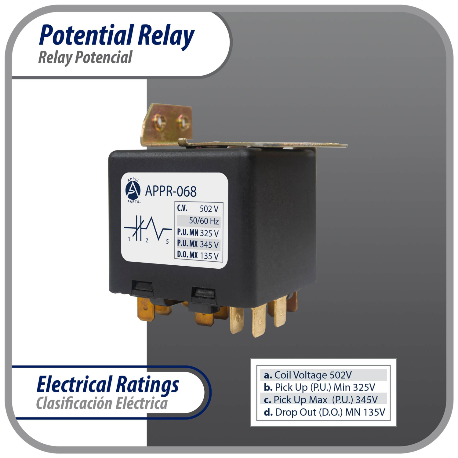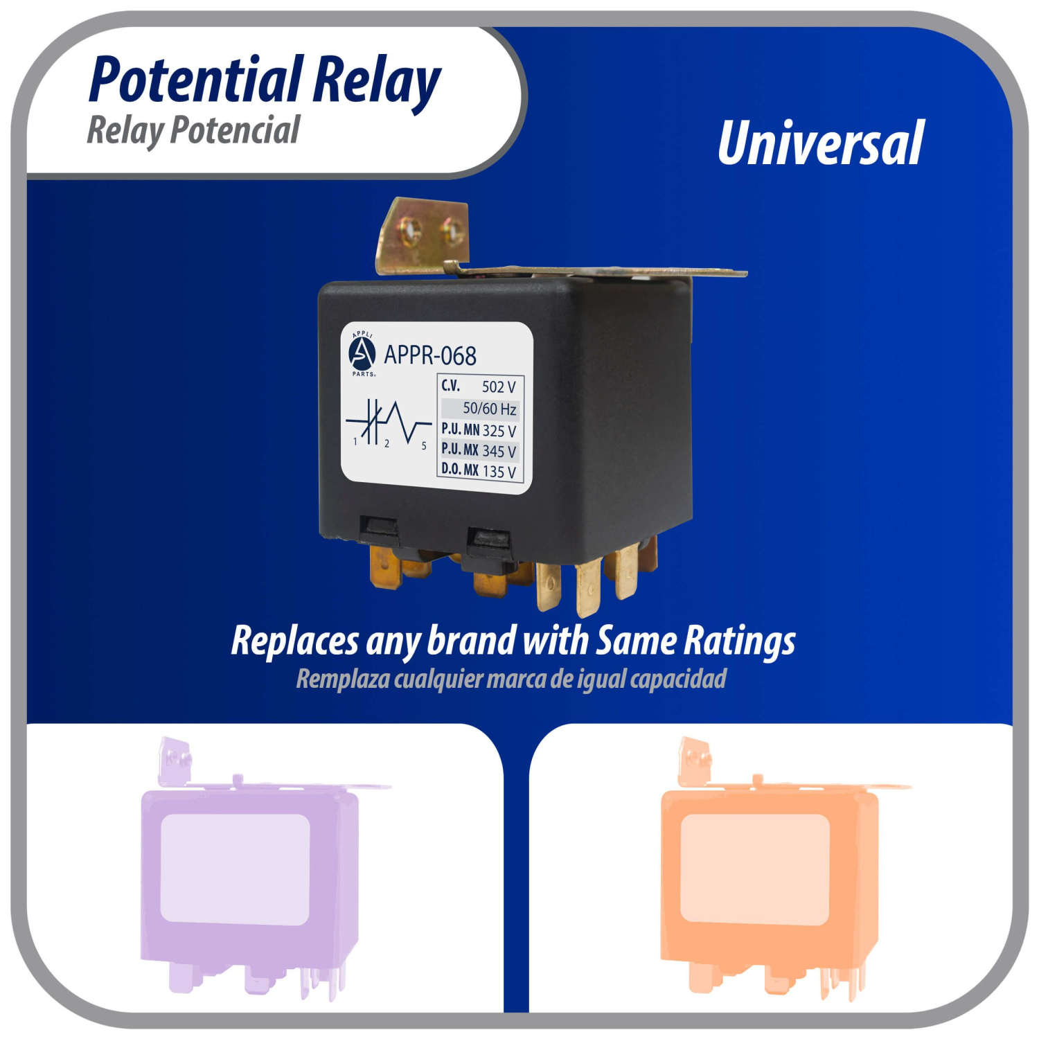 Appli Parts Potential Relay 068 Coil Voltage 502V Min Pick up 325V Max Pick up 345V Max Drop Out 135V 50/60 Hz Universal replacement for HVAC and Refrigeration units APPR-068
