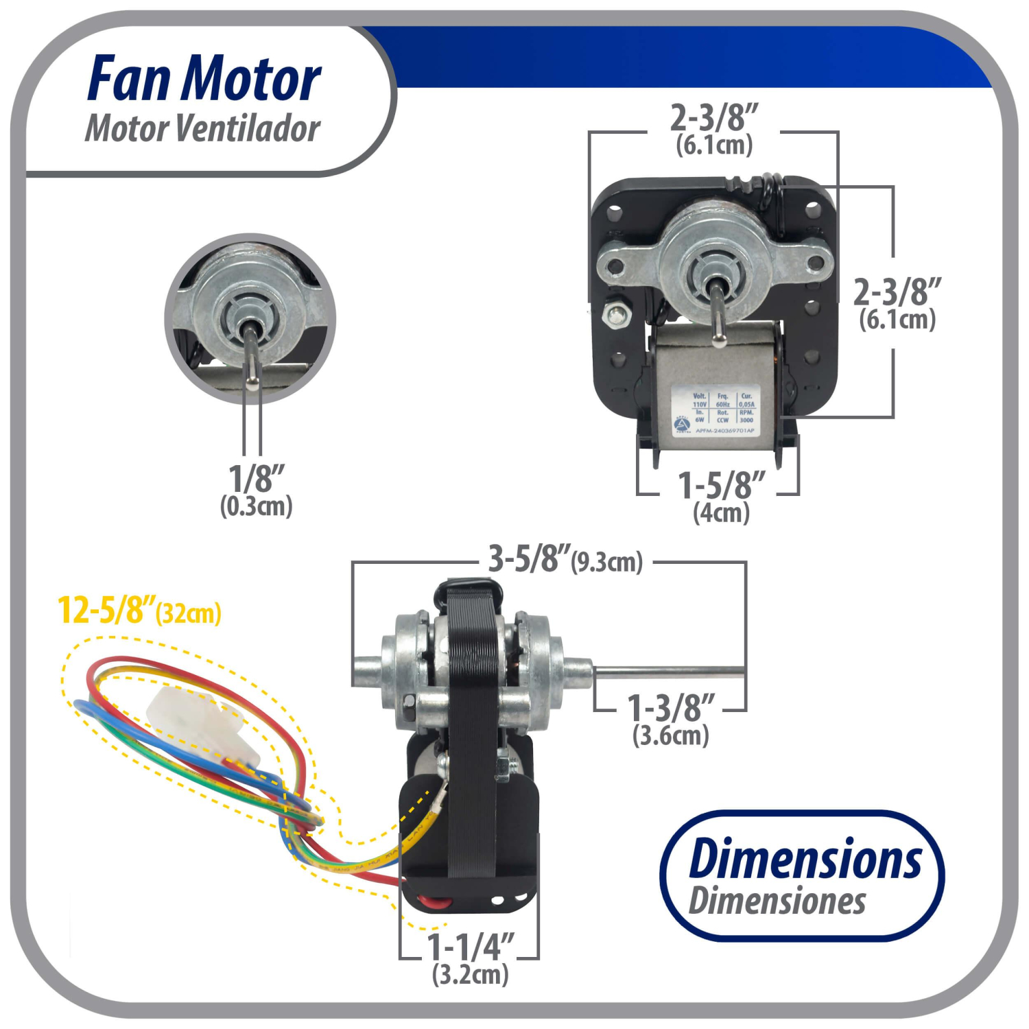 Use: Replacement for OEM refrigerator evaporator fan motor as well as for freezer evaporators. May be used for other applications were the use of a fan motor is necessarySpecs: Fan motor 110-125V 6W 0.05A CCW 60Hz 3000rpm 1/8in shaft diameter 1-3/8in shaft length.The fan spin may be reversed by inverting the shaft by removing the screws and flipping itCommon problems that indicate a failed fan motor are freezer of refrigerator compartments not cold enough. In some occasions you may be able to hear the faulty fan motor.Replaces: This part is used in multiple brand and models.Quality: Our products are manufactured following OEM quality standards to perform as direct replacement options. Please verify that the specs of theproduct you are purchasing are the same as the one you will replaceWeight : 1.29 LBR