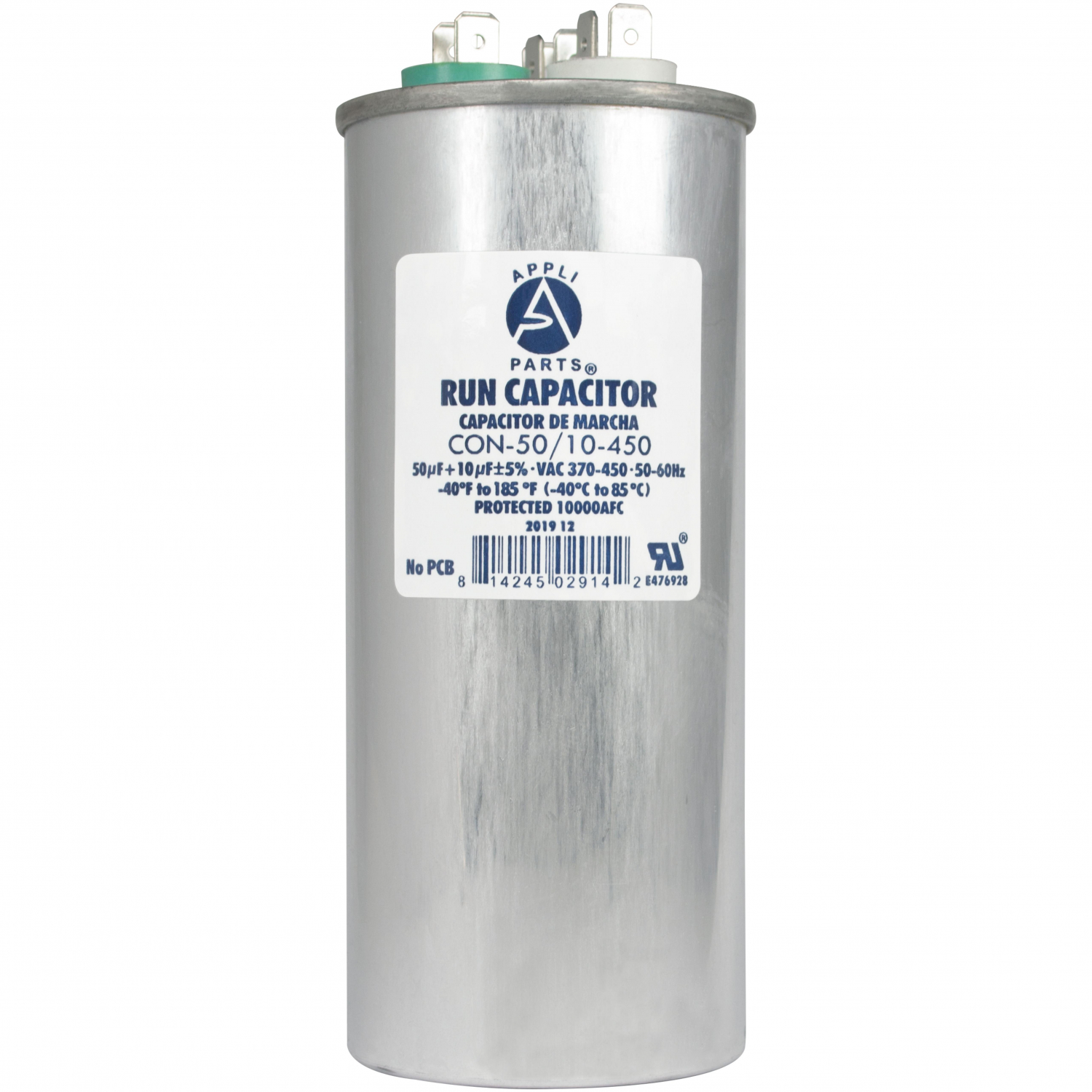 Appli Parts Dual Run Capacitor for ac 40+10 Mfd uF (microfarads) 370VAC or 450VAC CBB65 Round Universal fit for hvac and other applications 5-3/8 in High 2-1/8 in Wide CON-40/10-450