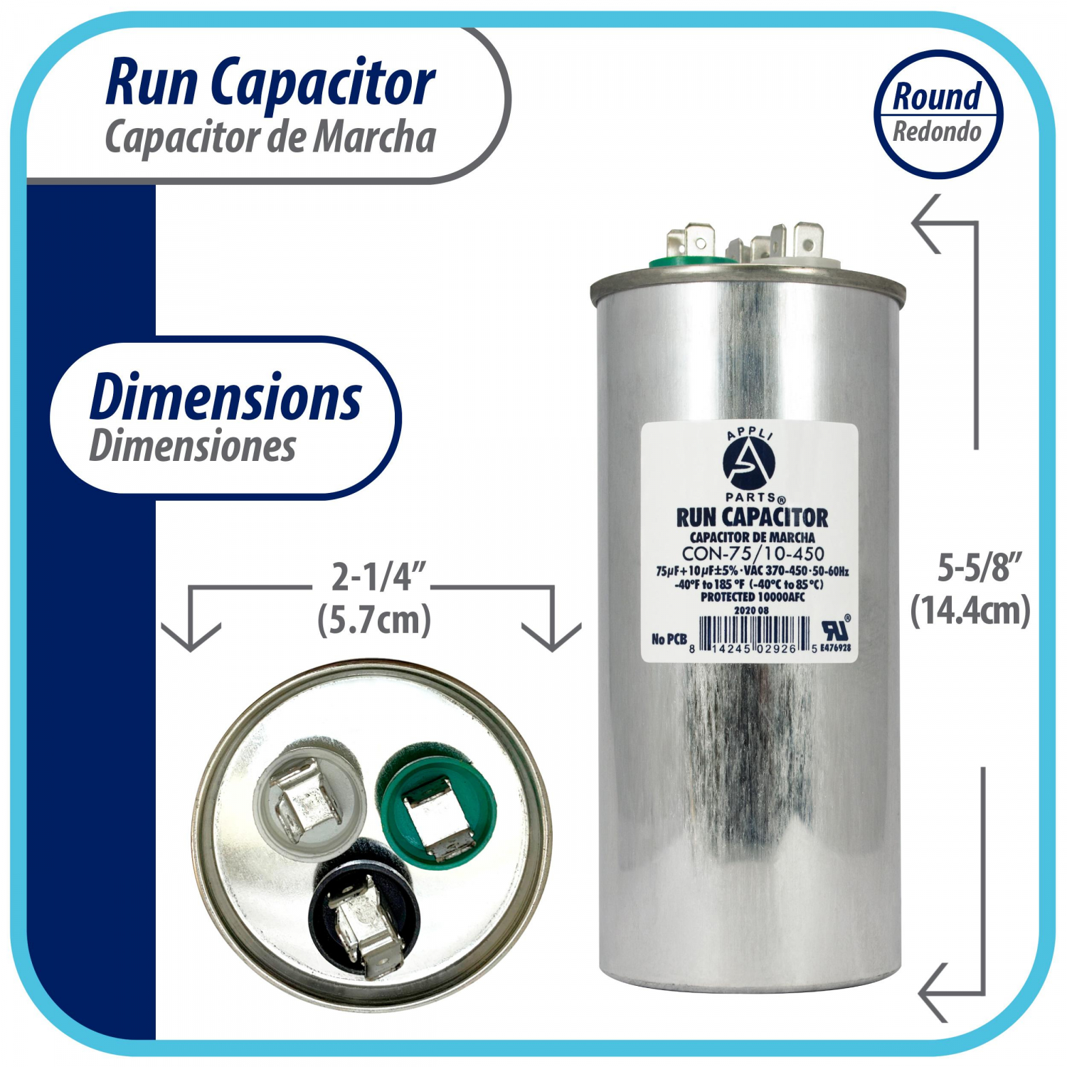 Appli Parts Dual Run Capacitor for ac 75+10 Mfd uF (microfarads) 370VAC or 450VAC CBB65 Round Universal fit for hvac and other applications 5-5/8 in High 2-1/4 in Wide CON-75/10-450