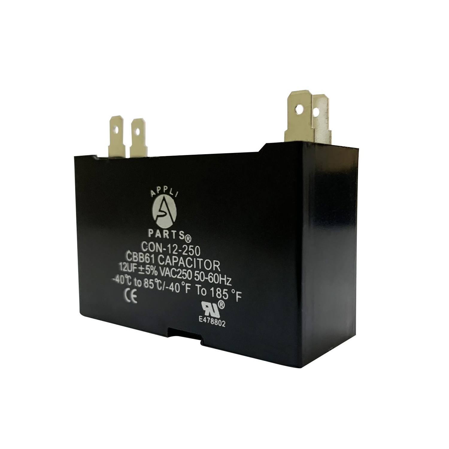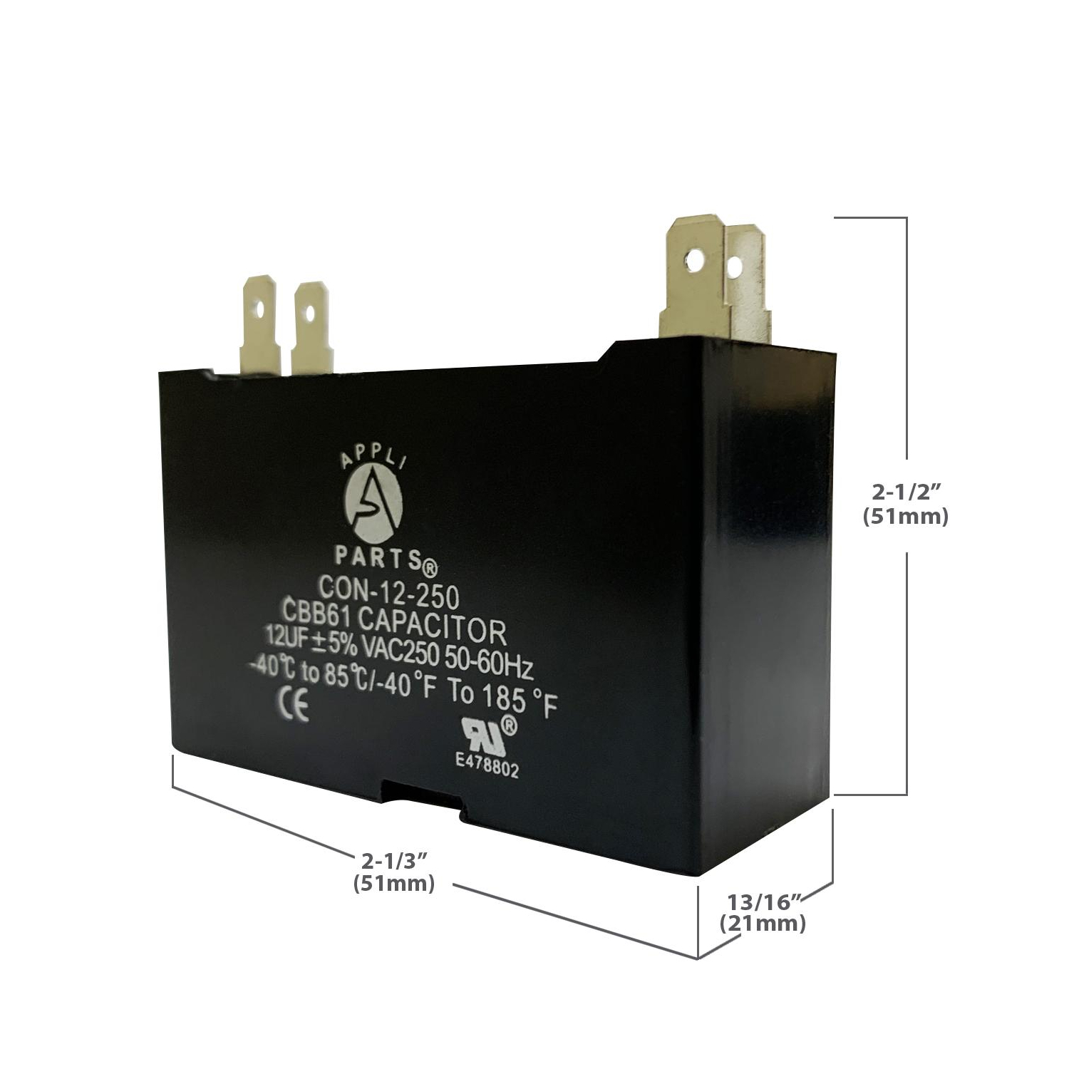 Appli Parts Fan Capacitor 12 mfd (microfarads) uf 250 VAC with 4 Terminal Connections compatible with any brand within the same range of capacitance 2-1/4in Width 7/8in Depth 1-3/4in Height CAP-12-250 Universal: Replaces any brand with the same capacitance capacity and voltage. Will work for 250VAC 1/16 in Male Quick-connect Quality: All our products are designed and manufactured following very strict procedures and high quality standards during their manufacture. An optimal selection of materials is made, combined with research and development procedures, which guarantee the durability and performance of each manufactured product, offering our customers the same efficiency expected from an original part. UL E478802 Certification, Manufactured with No PCB. CBB61 Specs: Tolerance is +/- 5% of capacity, working temperature environment from -40F (-40C) to +149F (65C), 50/60 Hz. Dimensions 2-1/4in Width 7/8in Depth 1-3/4in Height Applications: Fan capacitors have multiple applications, for ceiling fans, electric motors Replaces: CAP-12-250 CON-12-250