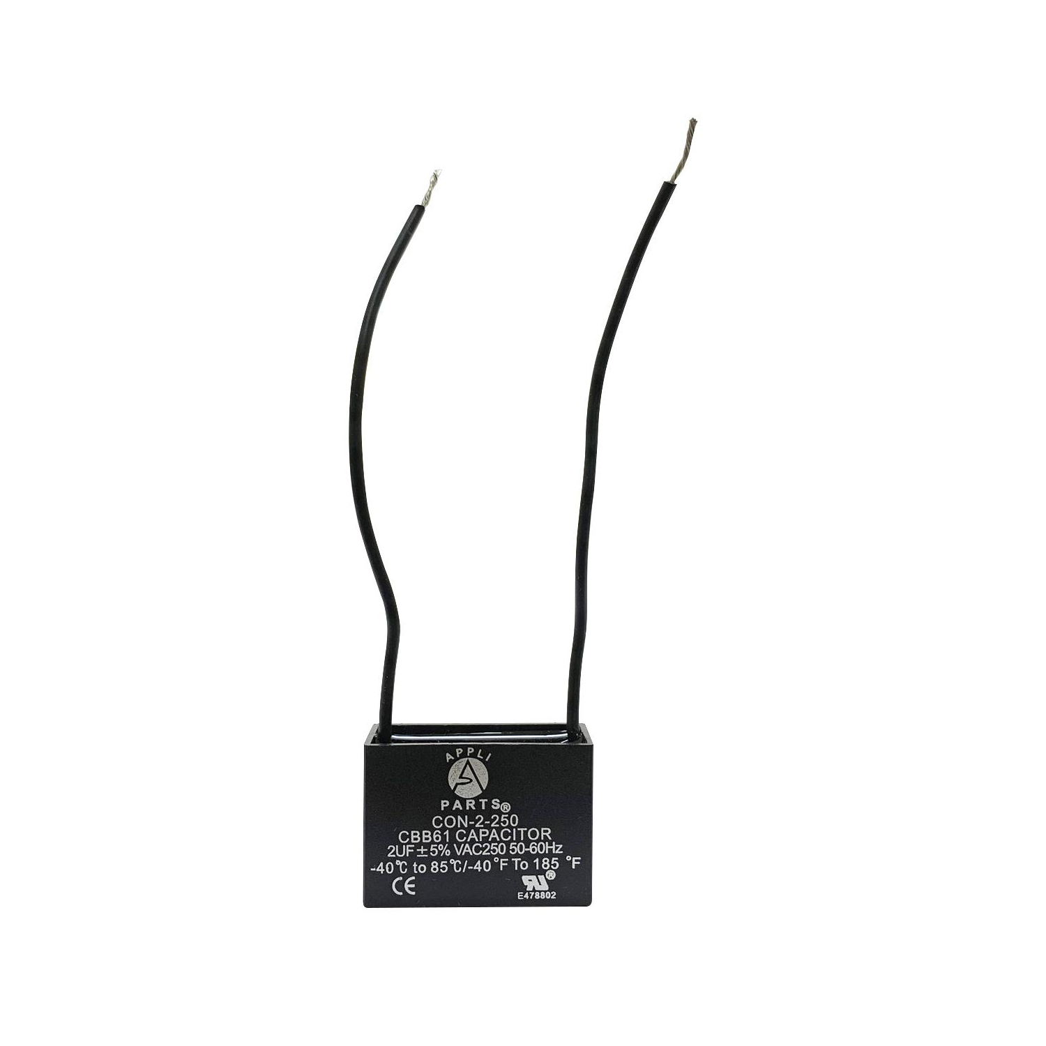 Appli Parts Fan Capacitor 2 mfd (microfarads) uf 250 VAC with 2 Wire Terminal Connections compatible with any brand with same capacitance 1-1/2in Width 5/8in Depth 1in Height CAP-2-250-2C Universal: Replaces any brand with the same capacitance capacity and voltage. Will work for 450VAC. 2 wire 4in long Quality: All our products are designed and manufactured following very strict procedures and high quality standards during their manufacture. An optimal selection of materials is made, combined with research and development procedures, which guarantee the durability and performance of each manufactured product, offering our customers the same efficiency expected from an original part. UL E478802 Certification, Manufactured with No PCB. CBB61 Specs: Tolerance is +/- 5% of capacity, working temperature environment from -40F (-40C) to +149F (65C), 50/60 Hz. Dimensions 1-1/2in Width 5/8in Depth 1in Height Applications: Fan capacitors have multiple applications, for ceiling fans, electric motors Replaces: CAP-2-250-2C CON-2-250