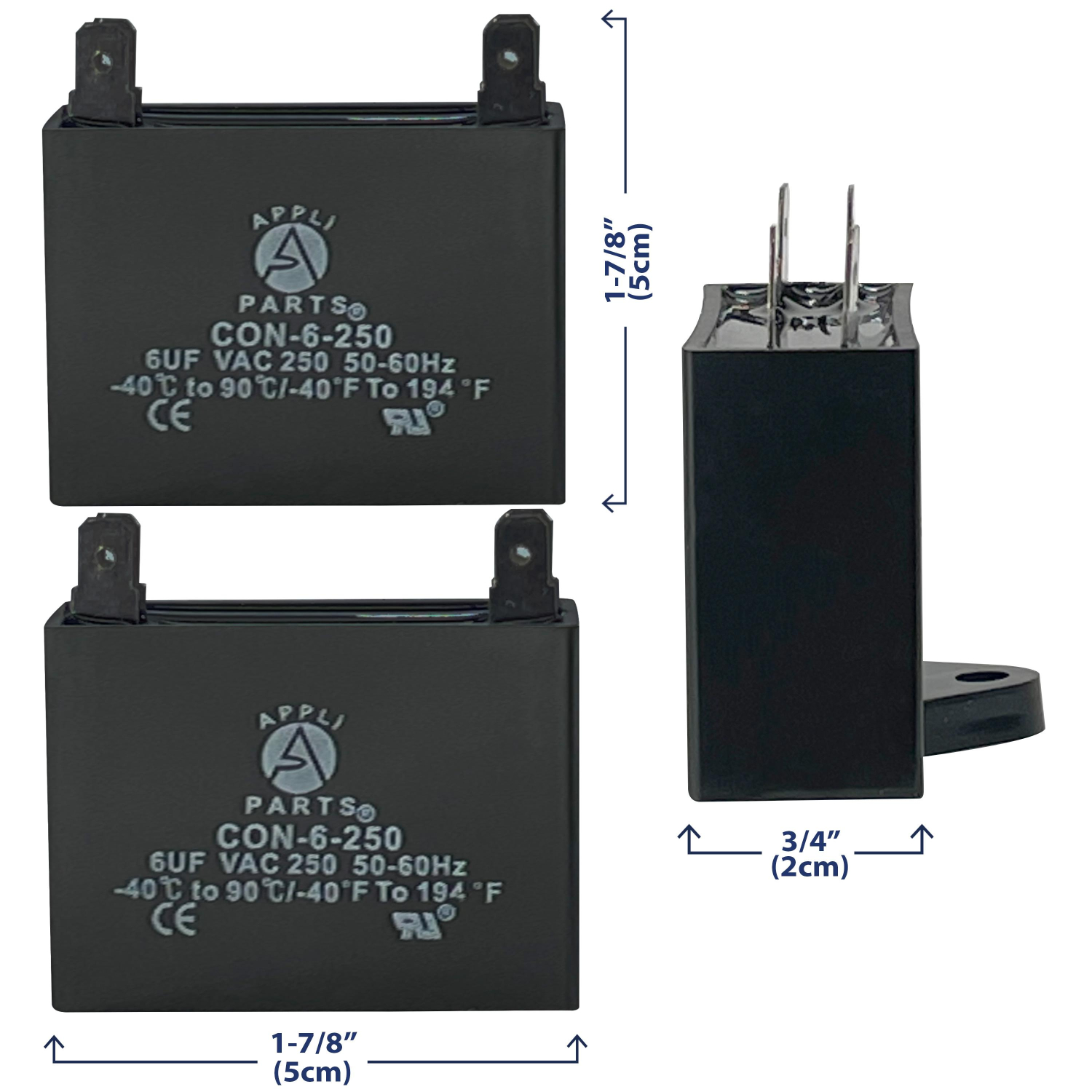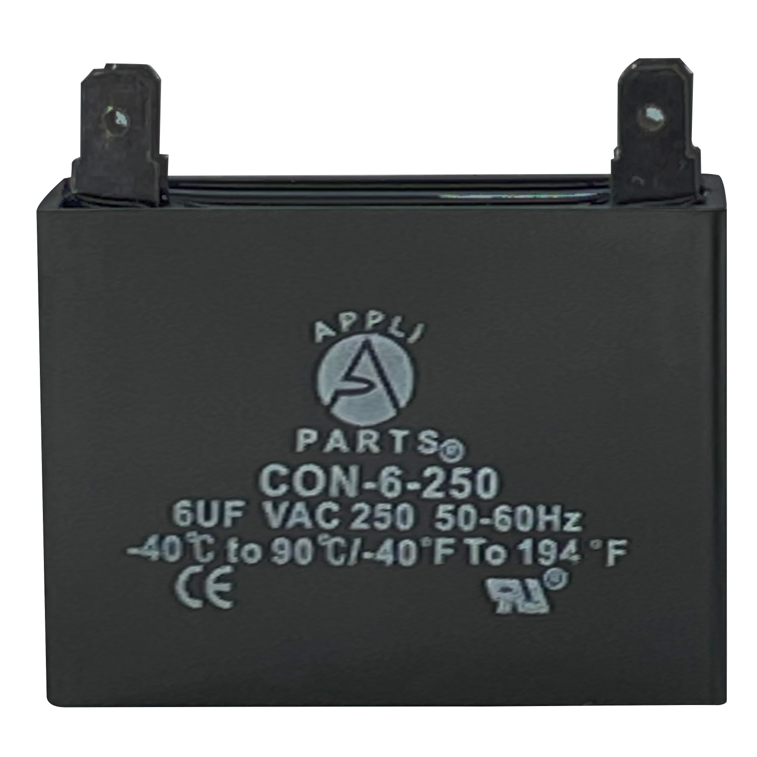 Appli Parts Fan Capacitor 6 mfd (microfarads) uf 250 VAC 4 Terminal Connections compatible with any brand within the same range of capacitance 1-7/8in Width 3/4in Depth 1-3/4in Height CAP-6-250 Universal: Replaces any brand with the same capacitance capacity and voltage. Will work for 250VAC 1/16 in Male Quick-connect Quality: All our products are designed and manufactured following very strict procedures and high quality standards during their manufacture. An optimal selection of materials is made, combined with research and development procedures, which guarantee the durability and performance of each manufactured product, offering our customers the same efficiency expected from an original part. UL E478802 Certification, Manufactured with No PCB. CBB61 Specs: Tolerance is +/- 5% of capacity, working temperature environment from -40F (-40C) to +149F (65C), 50/60 Hz. Dimensions 1-7/8in Width 3/4in Depth 1-3/4in Height Applications: Fan capacitors have multiple applications, for ceiling fans, electric motors Replaces: CAP-6-250 CON-6-250