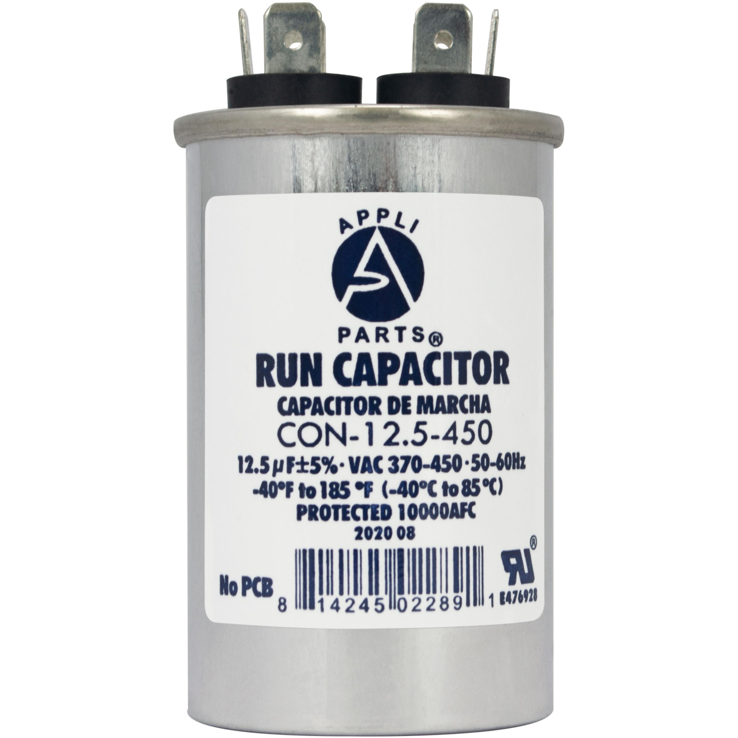 Appli Parts Run Capacitor for ac 12.5 Mfd uF (microfarads) 370 VAC or 450 VAC CBB65 Round Universal fit for hvac and other applications 3 in High 1-1/2 in Wide CON-12.5-450