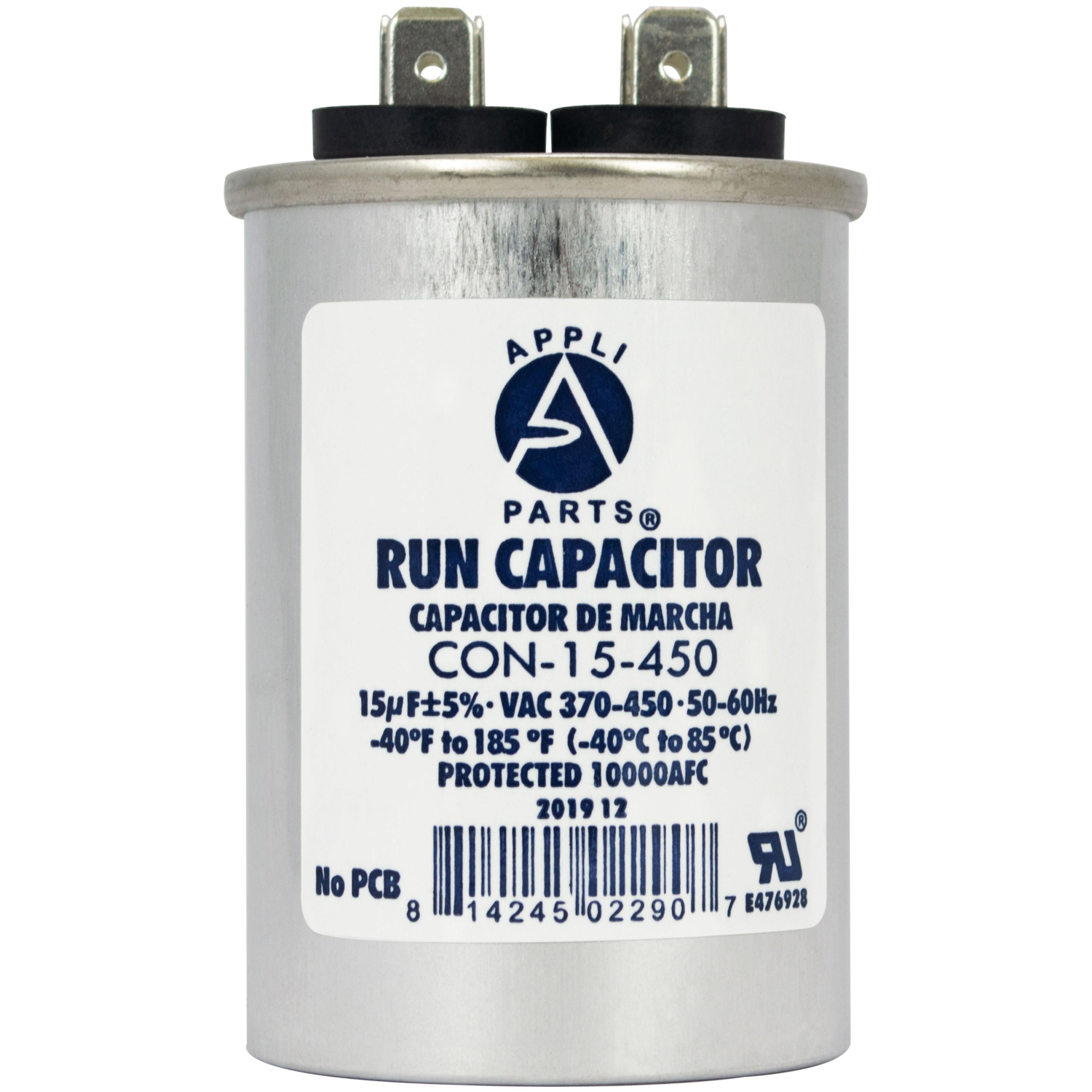 Appli Parts Run Capacitor for ac 15 Mfd uF (microfarads) 370 VAC or 450 VAC CBB65 Round Universal fit for hvac and other applications 3 in High 1-5/8 in Wide CON-15-450