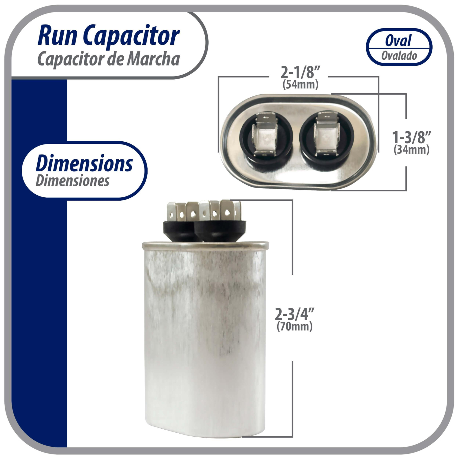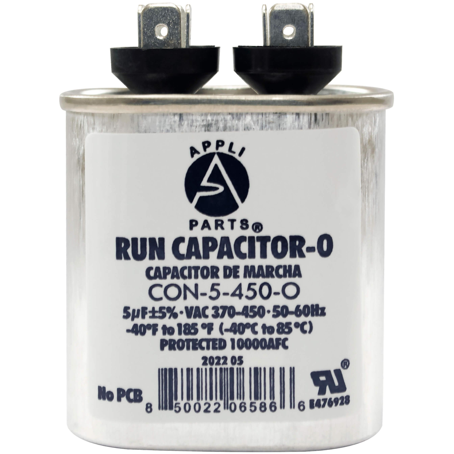 Appli Parts Run Capacitor for ac 5 Mfd uF (microfarads) 370 VAC or 450 VAC CBB65 Oval Universal fit for hvac and other applications 2-3/4in H 1-3/8in W 2-1/8in L CON-5-450-O Universal: Replaces any brand with the same capacitance capacity and voltage. Will work for 370V. 1/4 in Male Quick-connect Guarantee: UL E476928 Certified, Manufactured with No Pcb Specs: Tolerance is +/- 5 % of Capacity, Working temperature environment from -40F (-40C) to +185F (85C). Dimensions 2.75in Height 2.125in Lenght 1.375in Width Protection: Protected for 10,000AFC which means this product will not burst if by any reason is short circuits Replaces: TOC5 12005 12905 POC5A CAP-5-370