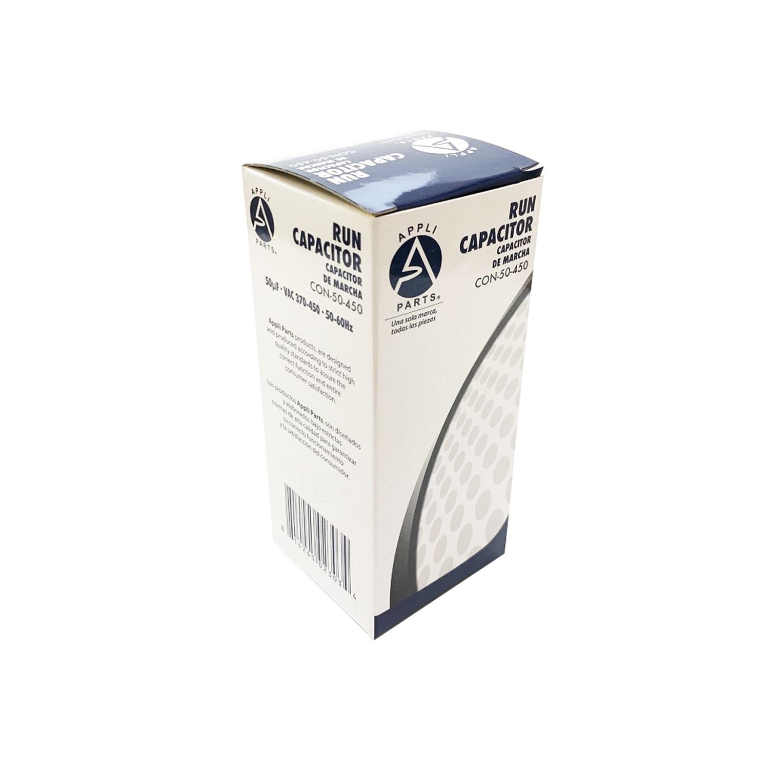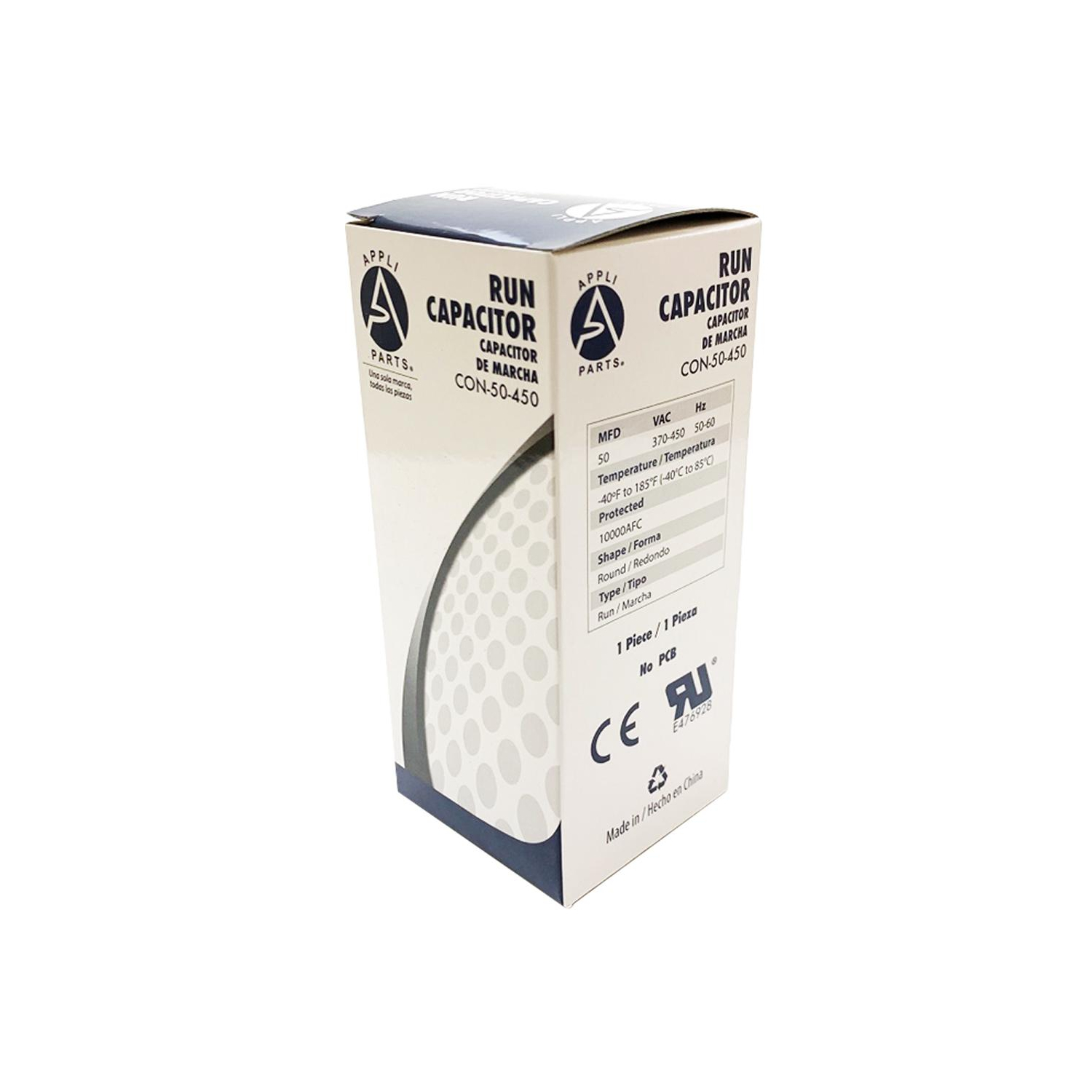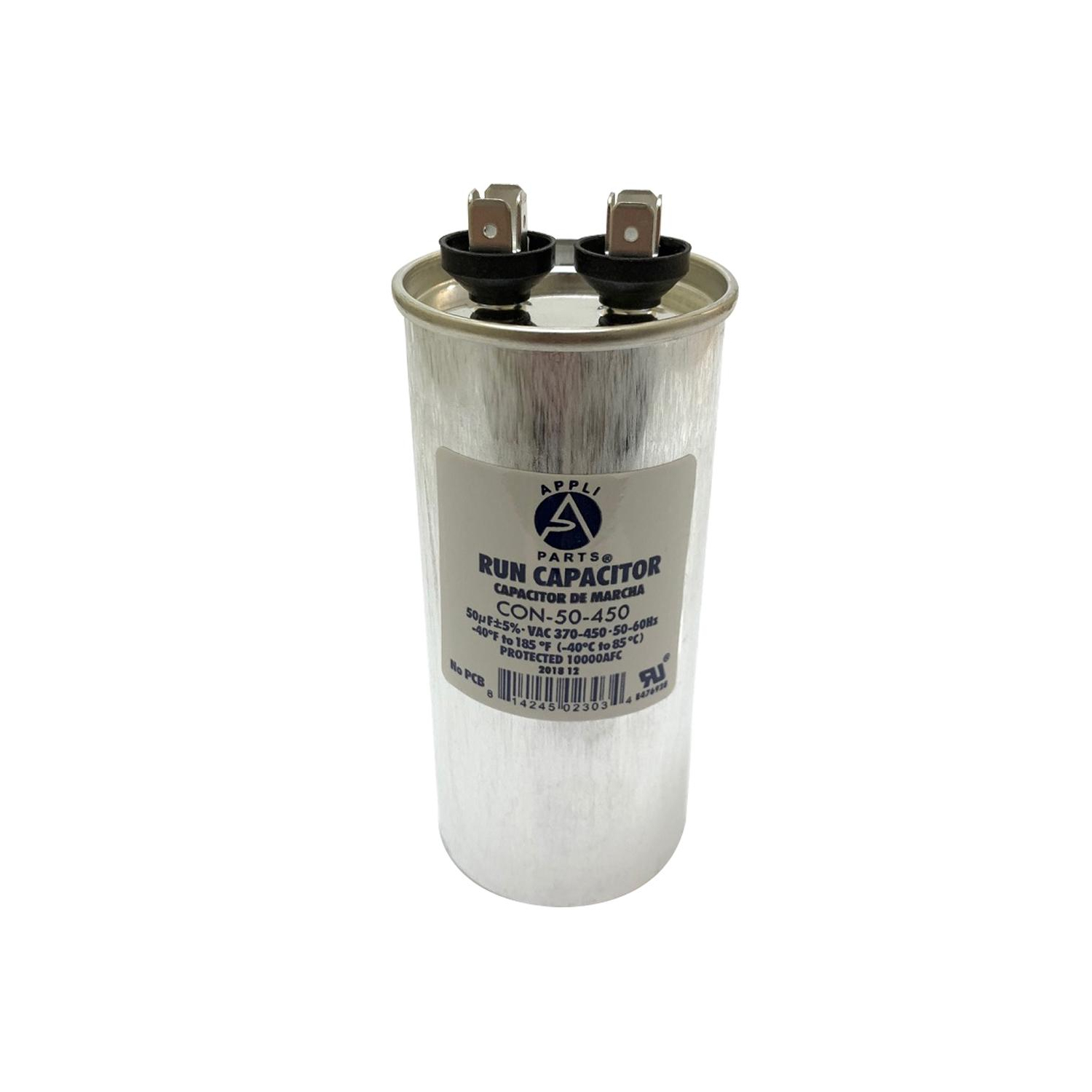 Appli Parts Run Capacitor for ac 50 Mfd uF (microfarads) 370 VAC or 450 VAC CBB65 Round Universal fit for hvac and other applications 4-3/4 in High 2 in Wide CON-50-450 Universal: Replaces any brand with the same capacitance capacity and voltage. Will work for 370V or 450V. 1/4 in Male Quick-connect Quality: All our products are designed and manufactured following very strict procedures and high quality standards during their manufacture. An optimal selection of materials is made, combined with research and development procedures, which guarantee the durability and performance of each manufactured product, offering our customers the same efficiency expected from an original part. UL E476928 Certified, manufactured with No PCB Specs: Tolerance is +/- 5 % of Capacity, Working temperature environment from -40F (-40C) to +185F (85C). Dimensions 4-3/4 in High 2 in Wide Protection: Protected for 10,000AFC which means this product will not burst if by any reason is short circuits Replaces: Rc0015 , Prcf50A , Rd-50-370 , 97F9623 , 473198 , A11122600Ux0608 , 2Mee4 , 97F5211 , C450R , Usa2217 , C350R