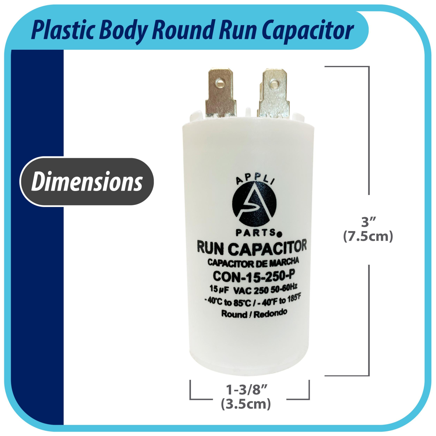 Appli Parts Run Capacitor for electric motors 15 Mfd uF (microfarads) 250VAC Plastic Case with terminals CBB60 Round Universal fit water pumps and others 3 in High 1-3/8 in Wide CON-15-250-P Universal: Replaces any brand with the same capacitance capacity and voltage. Will work for 250V. 1/4 in Male Quick-connect. Plastic case Quality: All our products are designed and manufactured following very strict procedures and high quality standards during their manufacture. An optimal selection of materials is made, combined with research and development procedures, which guarantee the durability and performance of each manufactured product, offering our customers the same efficiency expected from an original part. UL E476928 Certified, manufactured with No PCB Specs: Tolerance is +/- 5 % of Capacity, Working temperature environment from -40F (-40C) to +185F (85C). Dimensions 3in High 1-3/8in Wide Protection: Protected for 10,000AFC which means this product will not burst if by any reason is short circuits Replaces: CAP-15-250-P Volume : 0.01 FTQ