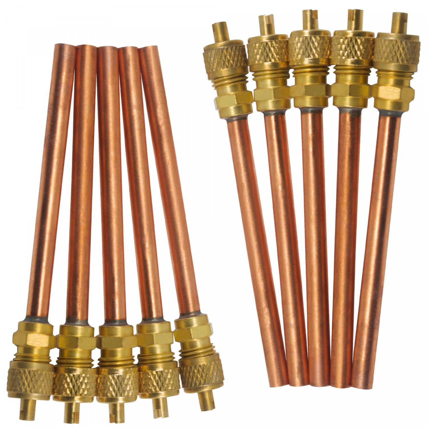 Specs: 10 Access valves with 1/4 SAE connection with Schrader valve and 1/4OD 3in long Copper stem. Cap includes valves core depressor remover and includes o-ring