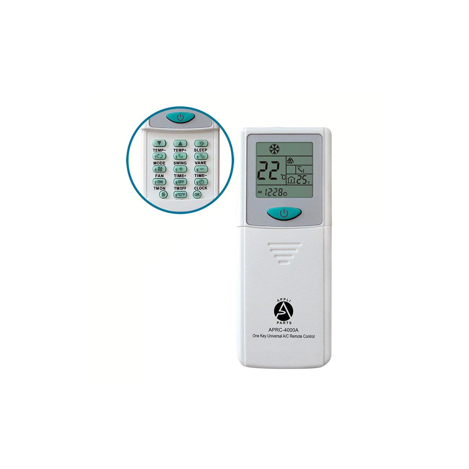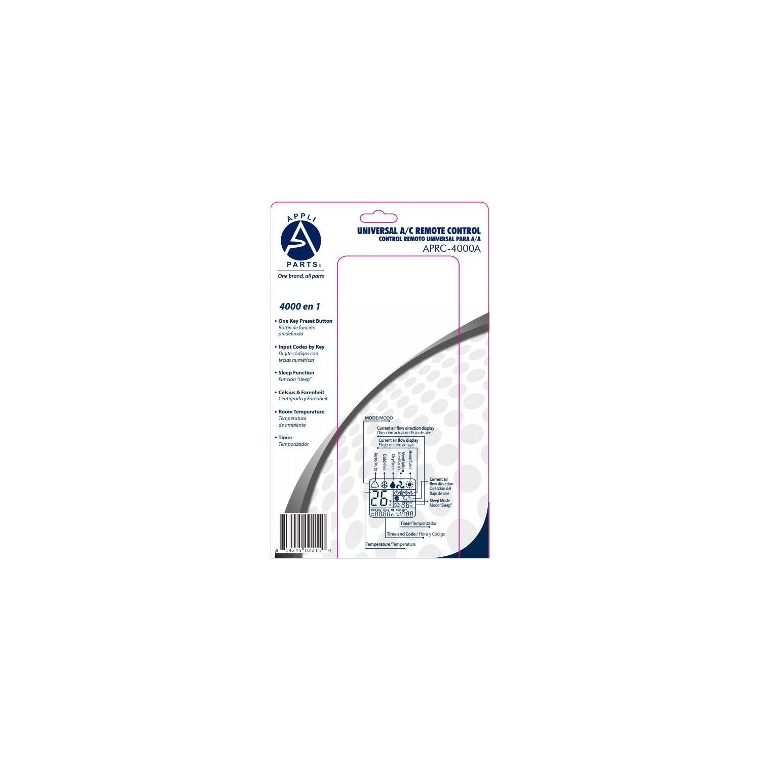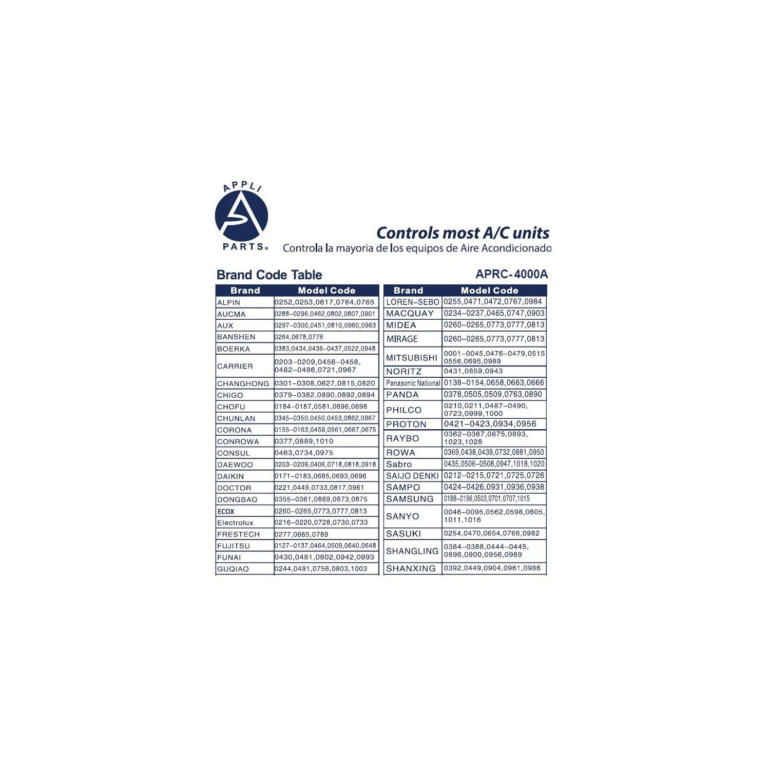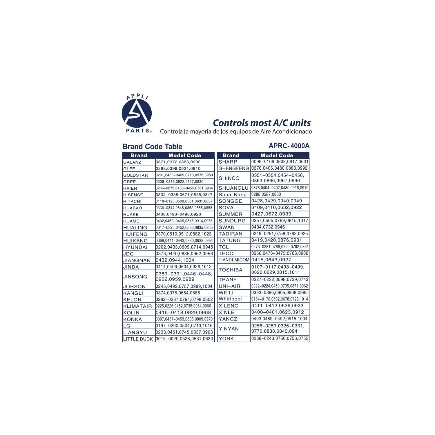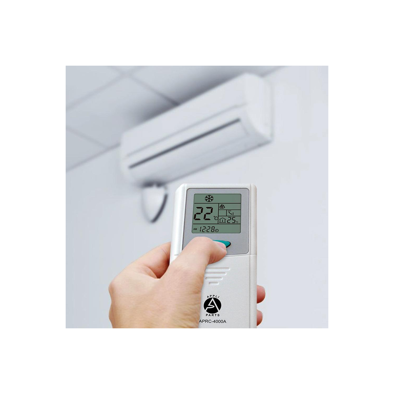 Appli Parts Universal A/C Remote Control, 2 in Lcd, Celsius and Fahrenheit Aprc-4000a (4.000 Frequencies) Temperature Reading: This Model Is Available For Celsius And Fahrenheit Temperature Settings Universal: The Large Number Of Frequencies 4.000, Makes This Remote Control Compatible To Nearly Every Brand Codes: Imput Codes Directly To Pair With Your Ac Unit Or Press One Key Function To Auto Set Timer: You Will Be Able To Set Timer On Or Off For Your A/C Unit Other: Clock, Room Temperature (Works As A Thermometer), Sleep Function And Many Other Options