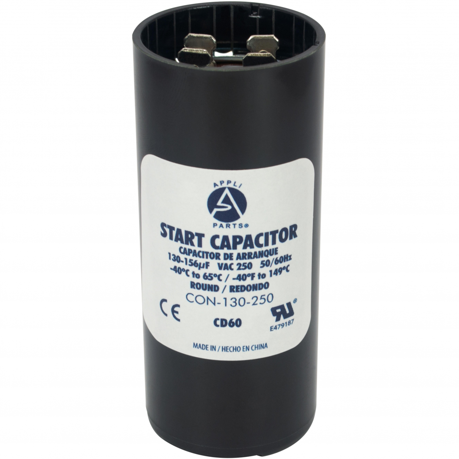 Appli Parts motor start capacitor 130-156 Mfd (microfarads) uF 250VAC universal fit for electric motor applications 1-7/16 in Wide 3-3/8 in Height CON-130-250