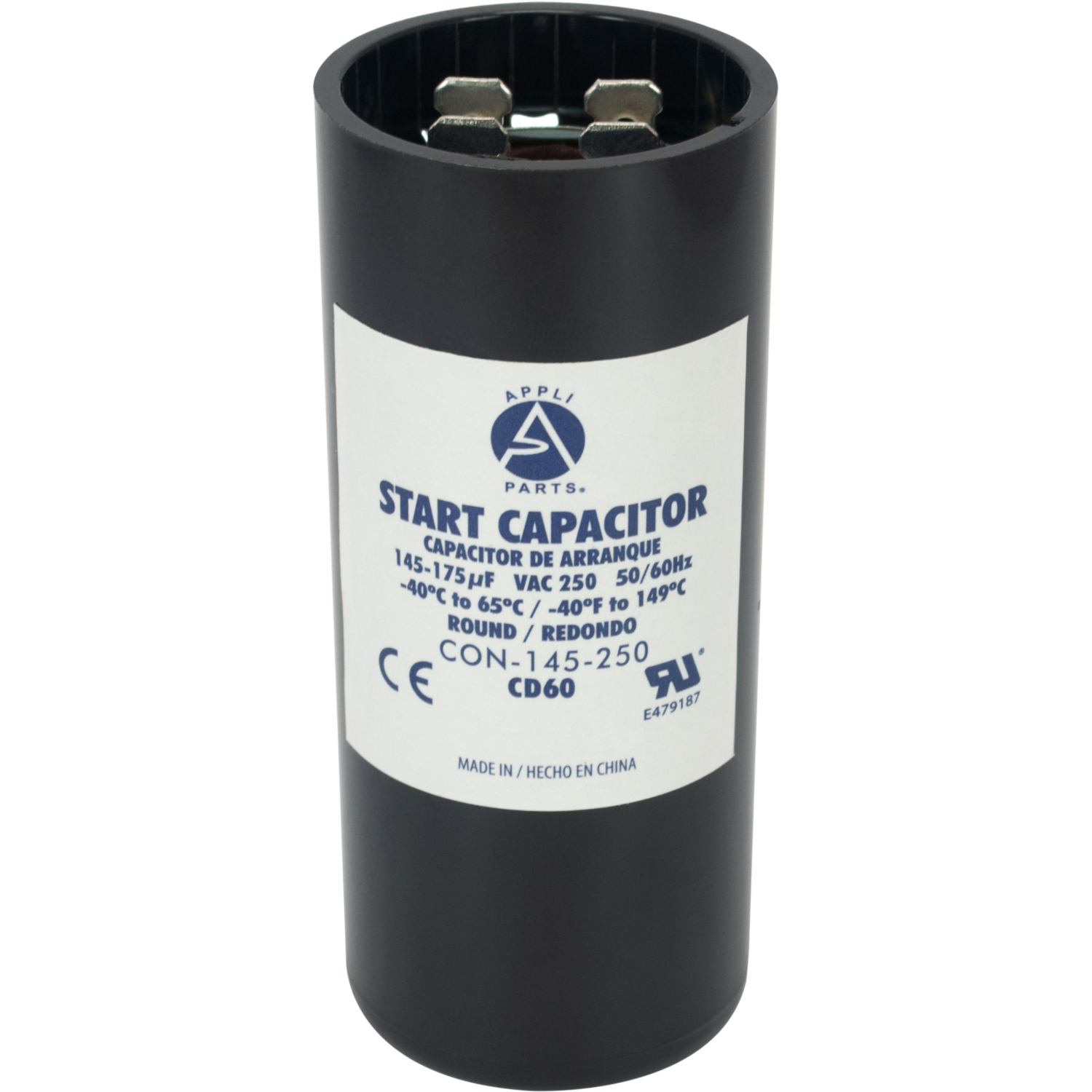 Appli Parts motor start capacitor 145-175 Mfd (microfarads) uF 250VAC universal fit for electric motor applications 1-7/16 in Wide 3-3/8 in Height CON-145-250