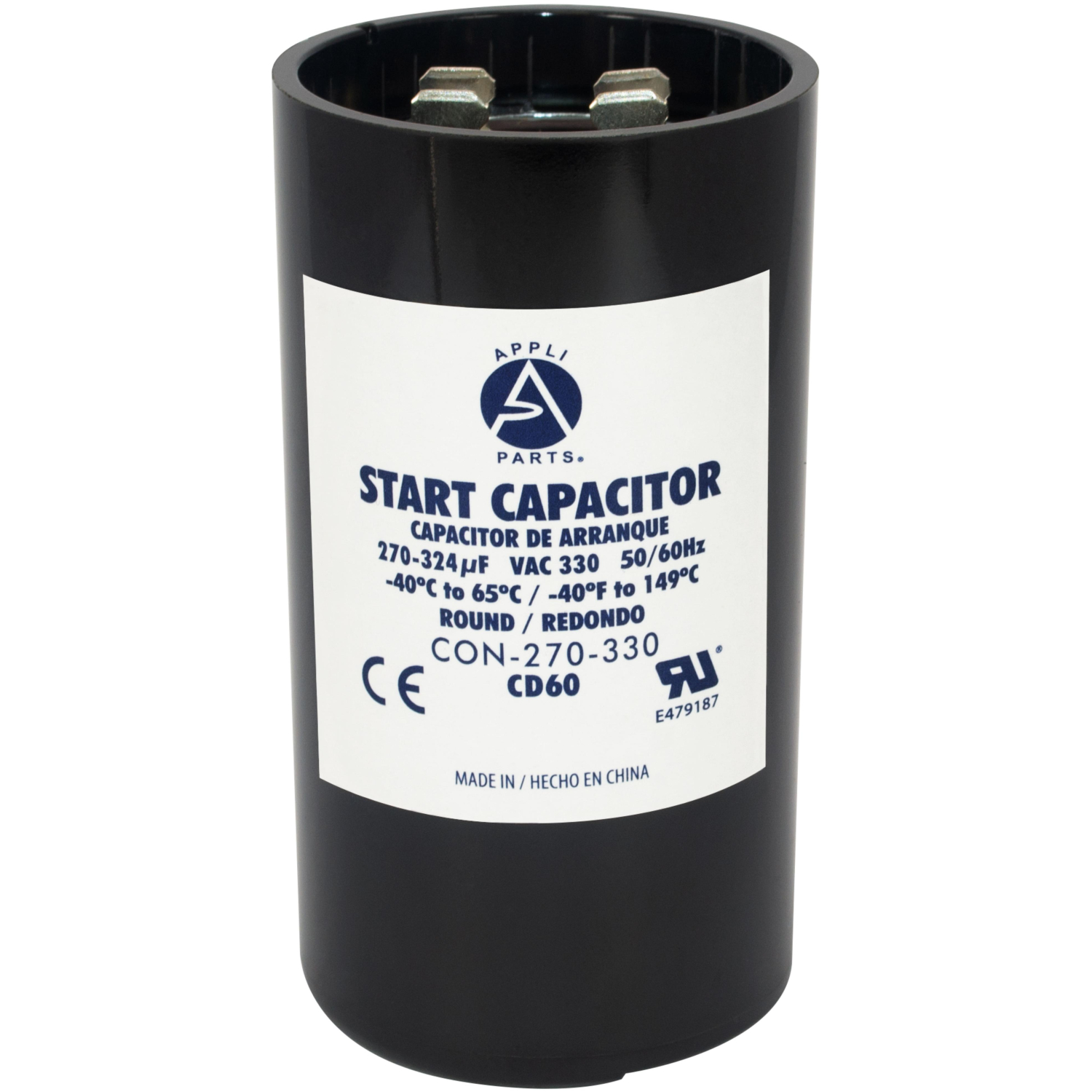 Appli Parts motor start capacitor 270-324 Mfd (microfarads) uF 330VAC universal fit for electric motor applications 1-3/4 in Wide 3-3/8 in Height CON-270-330