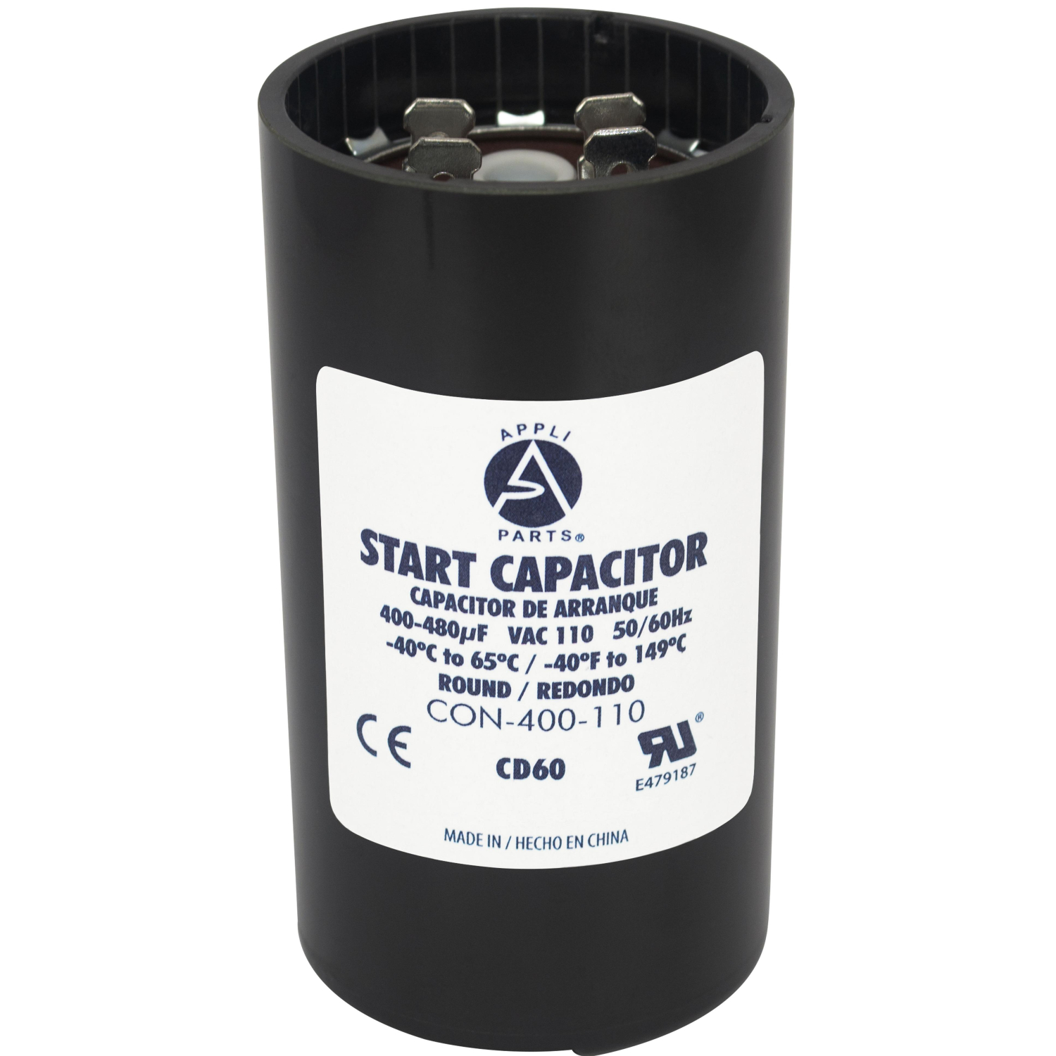 Appli Parts motor start capacitor 400-480 Mfd (microfarads) uF 110-125VAC universal fit for electric motor applications 1-3/4 in Wide 3-3/8 in Height CON-400-110