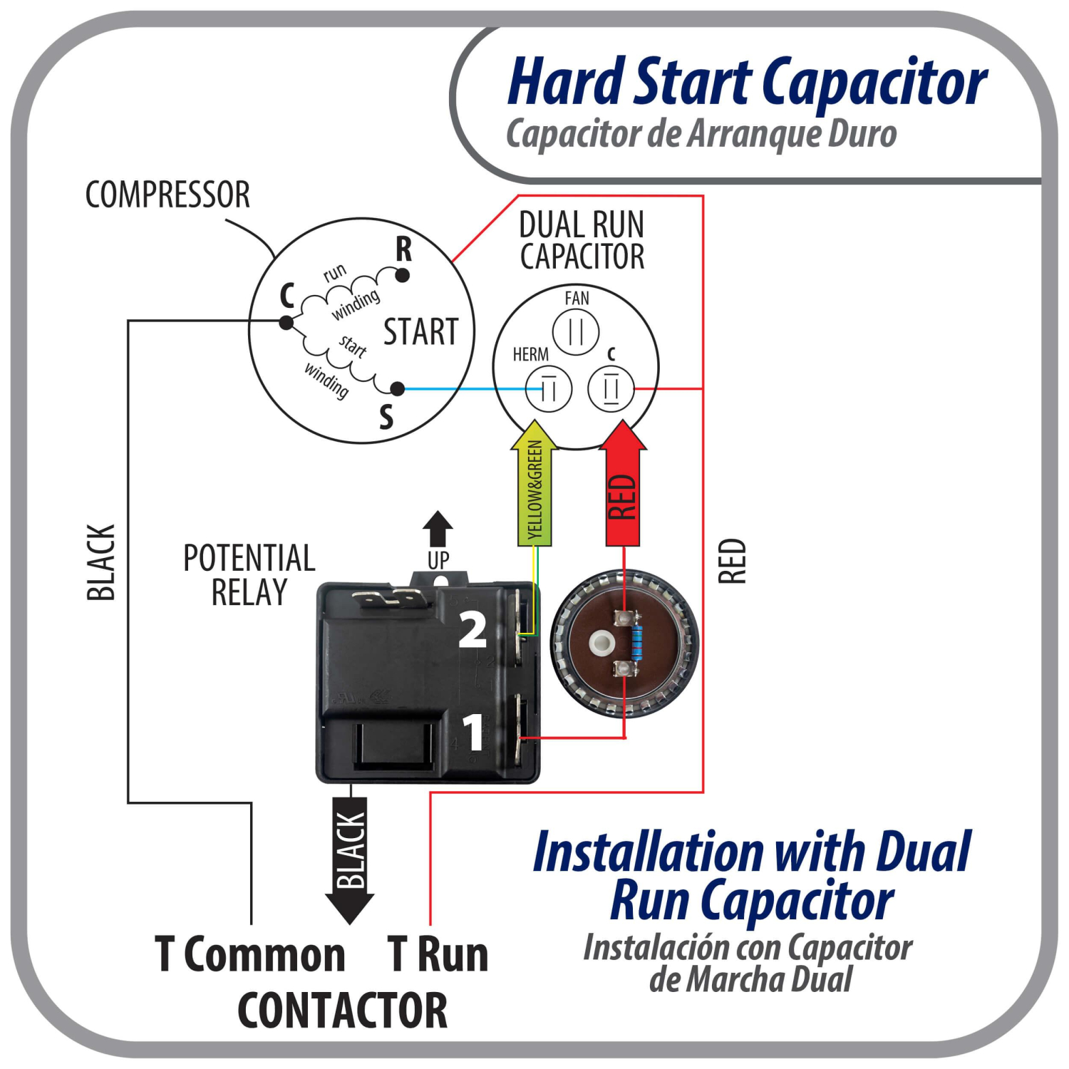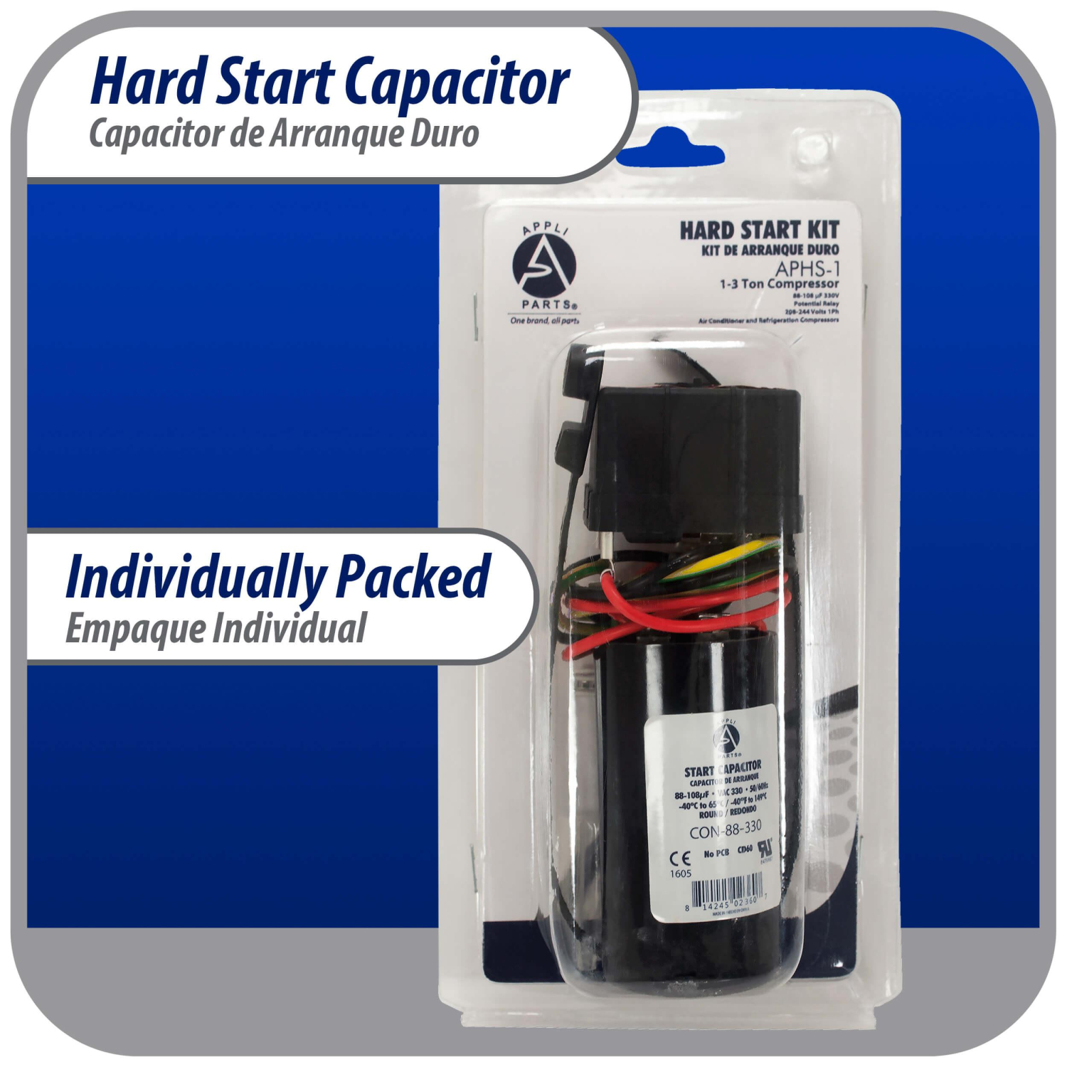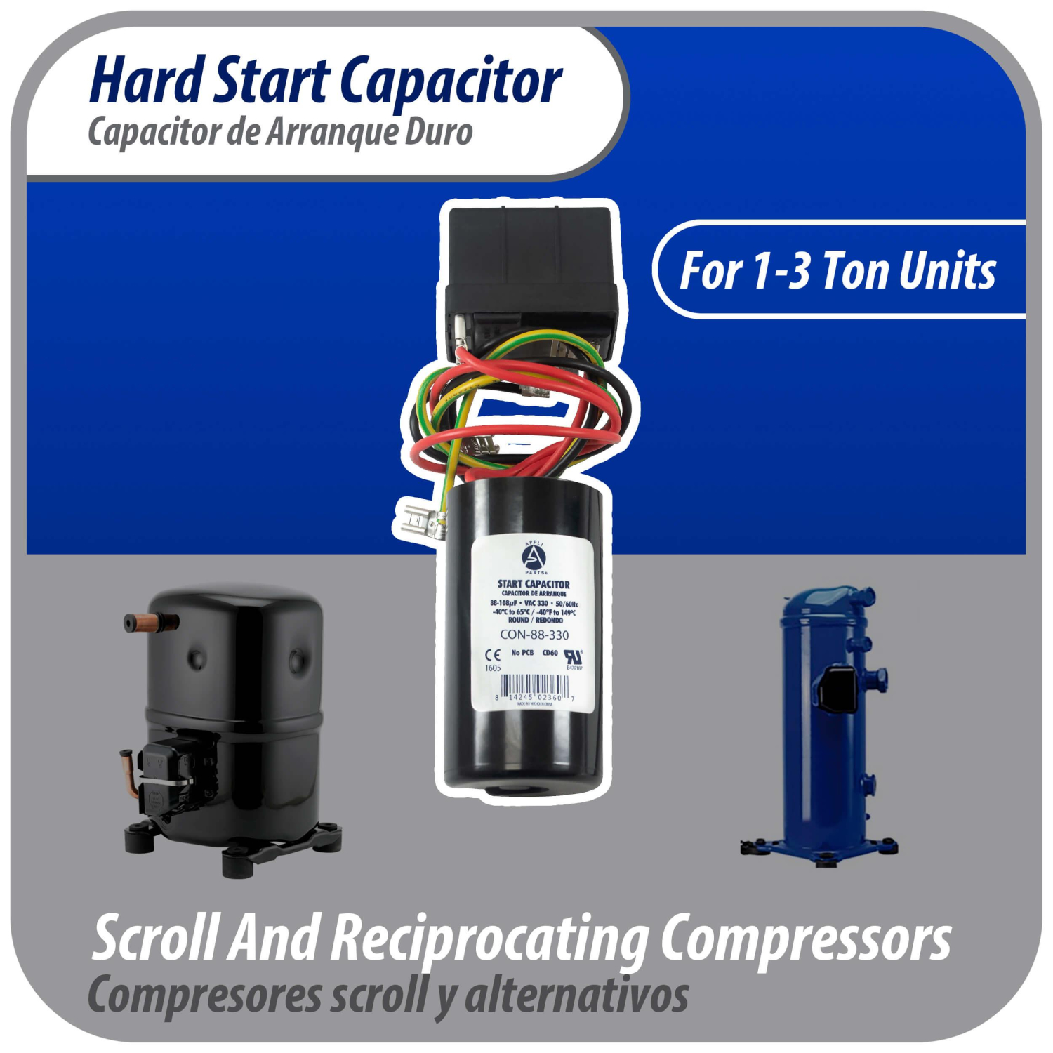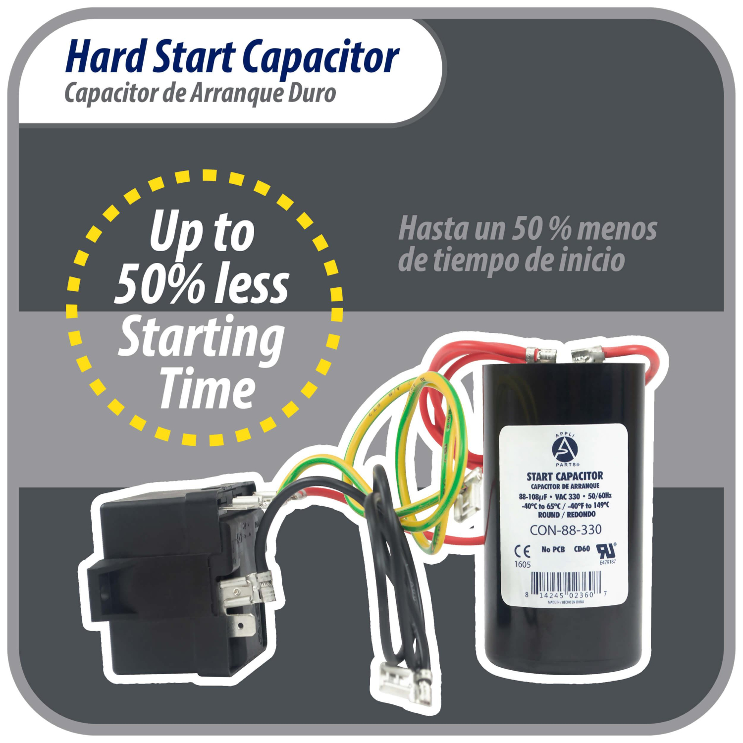 Use: this ac hard start kit can be used with Reciprocating and Scroll Compressors. 3 Different models available for the size of your air conditioning unit Specs: This a c hard start kit includes a start capacitor 88 to 108 microfarads and a potential relay for compressors from 1 to 3 Ton. Works for Voltage 208-244 Installation: Pre wired, just follow the steps shown on the package. Easily installed with a Single Run Capacitor or a Dual Run Capacitor. Connect cables accordingly and attached to condenser body Benefits: Faster compressor start up time which lowers the electricity draw from the system. This allows you to save money and increase the performance and durability of the ac system Universal: May be installed and any brand, replace any 3 and 1 hard start. Kit includes plastic wrap and screws for easy hookup. Save yo time and money.