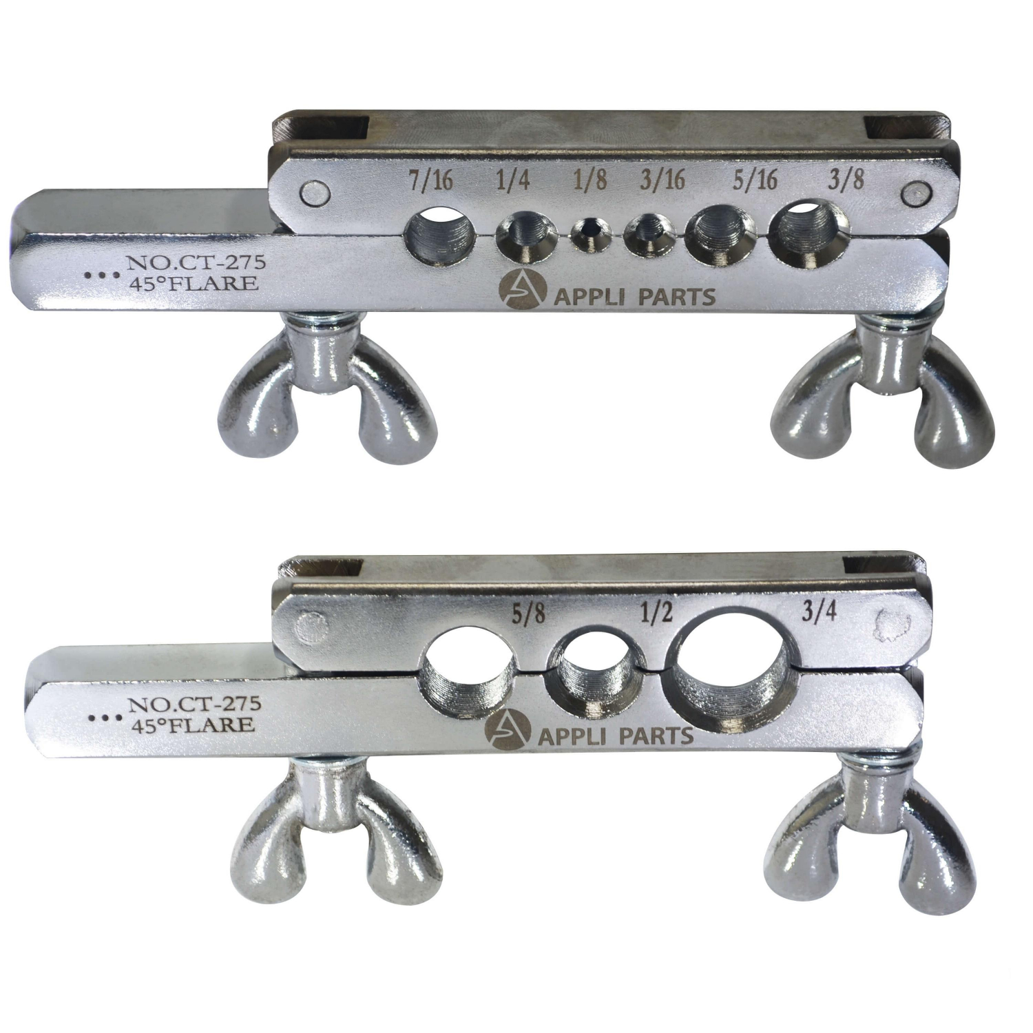 Appli Parts professional Flaring tool kit and swage tool kit for copper plastic aluminum pipe and other soft metal tube with cutter and ratchet wrench for HVAC and other applications APT-FT278 Use: This Complete 10 Piece flare Tool Kit includes every tool a professional needs to properly flare plastics and soft metals Includes: Flaring bar holes 1/8, 3/16, 1/4, 5/16, 3/8, 7/16, 1/2, 5/8 and 3/4 inch Includes: Expansion tube adapters 3/16, 1/4, 5/16, 3/8, 1/2, 5/8 and 3/4 inch. Includes: Tube cutter: 1/8 to 1-1/8 inch and Ratchet Wrench: 1/4, 3/8, 3/16 and 5/16 inch This professional grade heavy duty pipe flaring tool kit comes in a plastic case to protect all the pieces. It has been manufactured following high quality procedures. Not intended as double tube flaring tool kit Quality: All our products are designed and manufactured following very strict procedures and high quality standards during their manufacture. An optimal selection of materials is made, combined with research and development procedures, which guarantee the durability and performance of each manufactured product, offering our customers the same efficiency expected from an original part