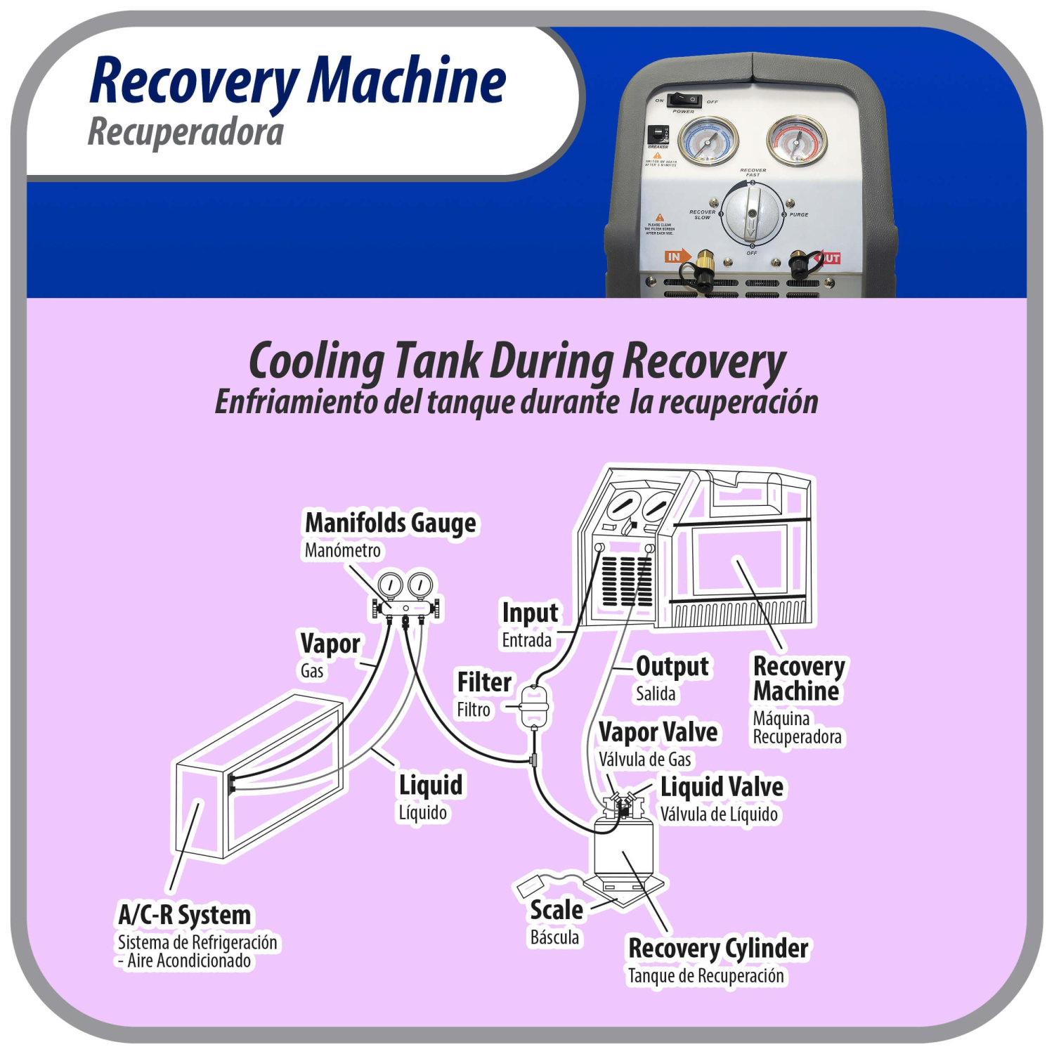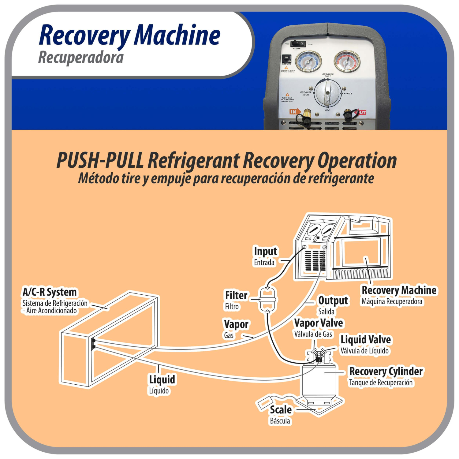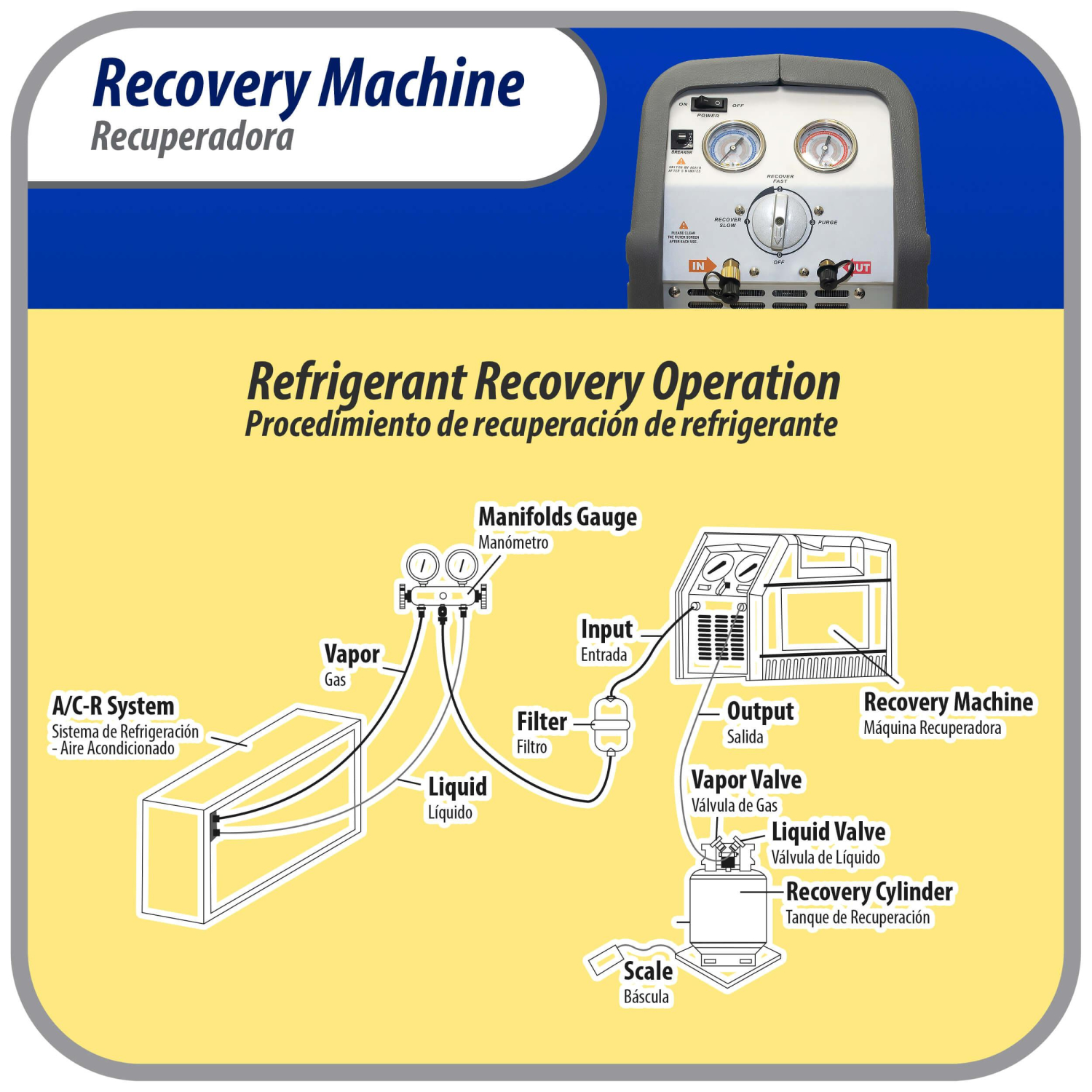 Quick Recovery: Oil-less 1/2HP Compressor model for High performance recovery of medium size systems in a shorter time. The portability of the machine as well as the 110V applications makes it suitable for any job location