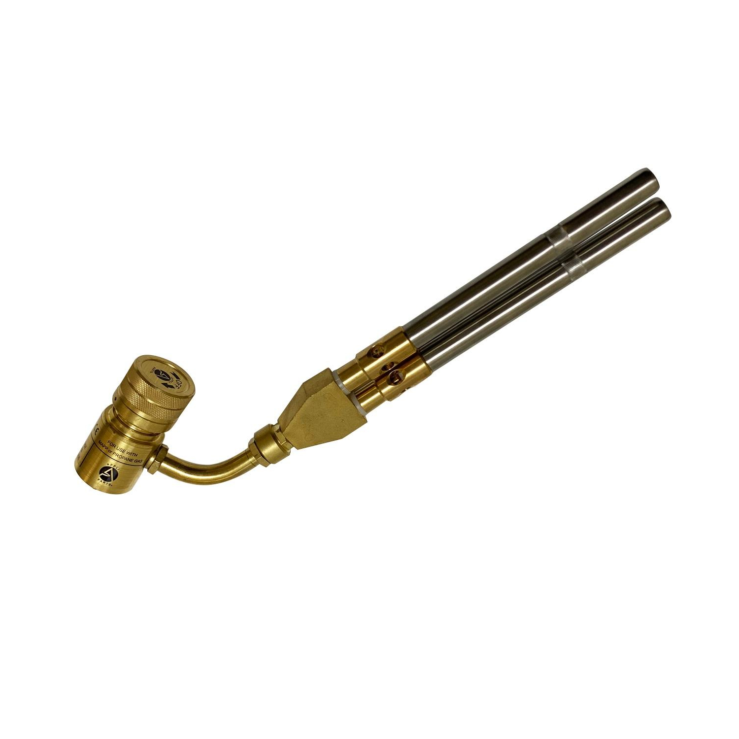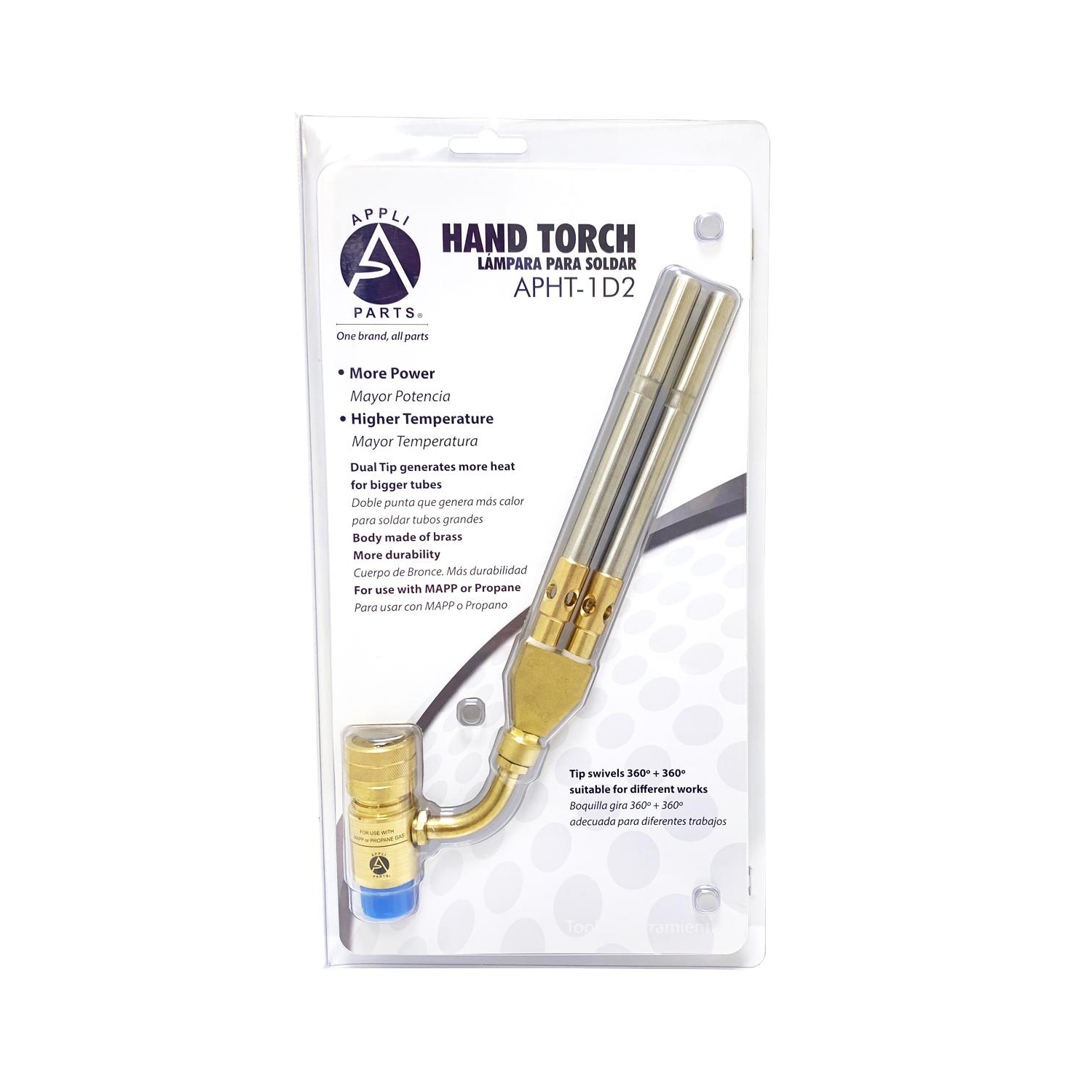 Appli Parts APHT-1D2 Double Burner Hand Torch for Soldering Brazing with Map or Propane Fuel Swivel Tip for uses in plumbing refrigeration air conditioning and more Construction: Brass body and stainless steel tip Application: Used For Copper/Brass Tube And Fittings Welding Up To 4 In Brazing Up To 3 In Use: For plumbing, refrigeration, air conditioning, electrical, professionals and diy soldering/welding applications. Use with mapp or propane tanks. Adaptable to 14.1 - 16 Oz Specs: Standard connection CGA600, 375 PSI max gas pressure, max temperature 2400F, tip rotation 360 degrees Quality: All our products are designed and manufactured following very strict procedures and high quality standards during their manufacture. An optimal selection of materials is made, combined with research and development procedures, which guarantee the durability and performance of each manufactured product, offering our customers the same efficiency expected from an original part