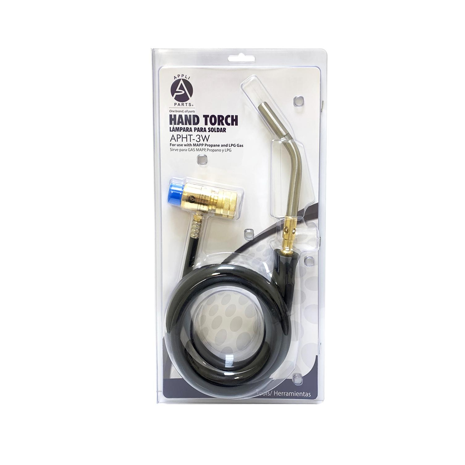 Appli Parts APHT-3W single burner hand torch with 5 ft hose and handle for soldering welding and brazing with map or propane fuel for HVAC and Plumbing Use: For plumbing, refrigeration, air conditioning, electrical, professionals and do it yourself soldering and welding applications Specs: Standard connection CGA600, 375 Psi Max Gas Pressure, Max Temperature 2,100 F. Tank not included Fuel: Use with mapp or propane tanks. Adaptable to 14.1 - 16 oz. Verify connection CGA600 Construction: Brass body and adjustable fuel regulator and stainless steel head or tip. Plastic handle for easy manipulation and comfort grip Safety: Always use this product under adult supervision. When lighting ensure that the point is facing away from you or any other person. Open to the max and then closed to the desired flow.